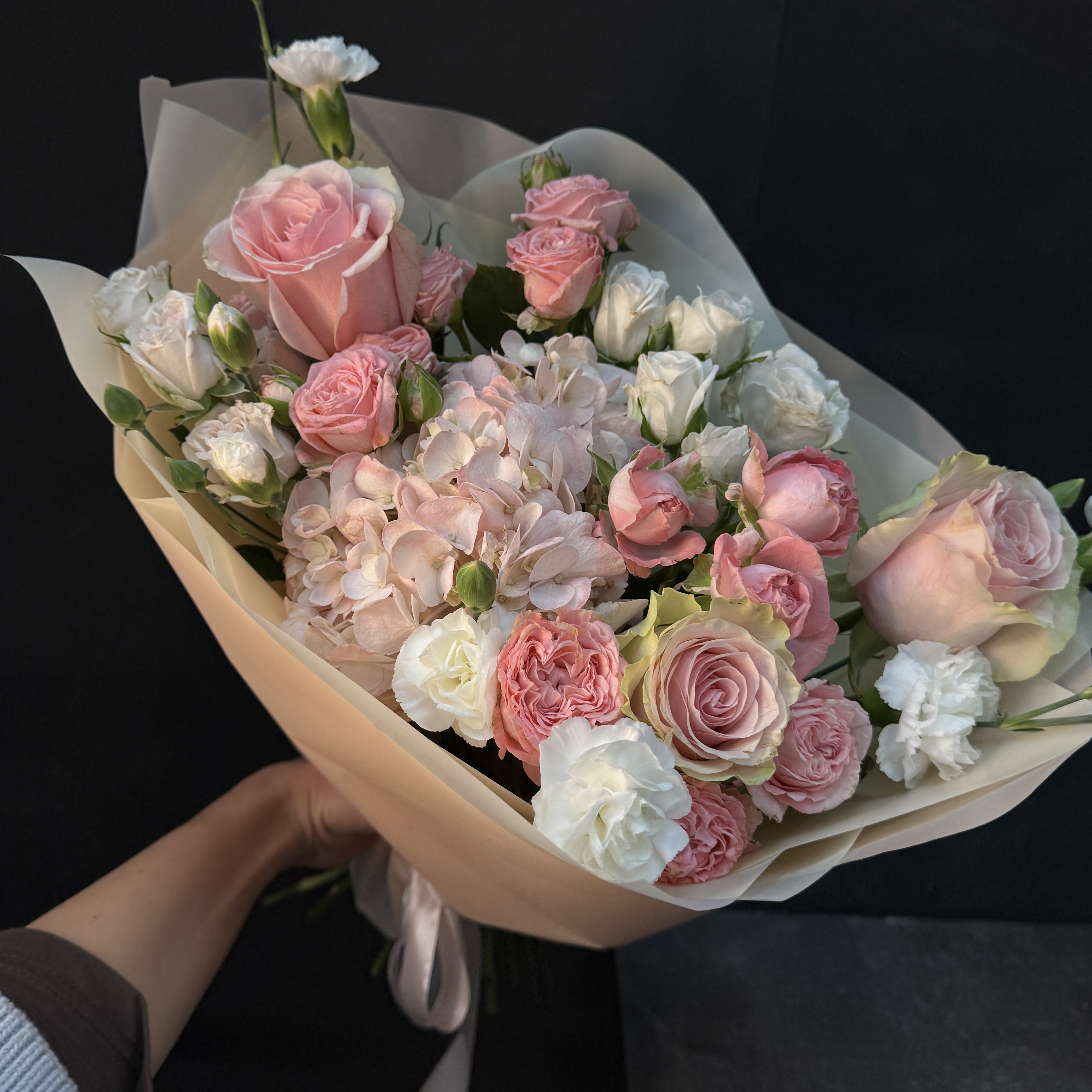 Погрузитесь в волшебство природы с нашим изысканным букетом! Гортензия, нежные кустовые розы и очаровательные диантусы сплетаются в гармонию красоты и аромата. Это идеальное решение, чтобы выразить свои чувства к любимому человеку или подчеркнуть исключительность особого события. Настоящий шедевр флористики – ваш гарантированный способ произвести впечатление!