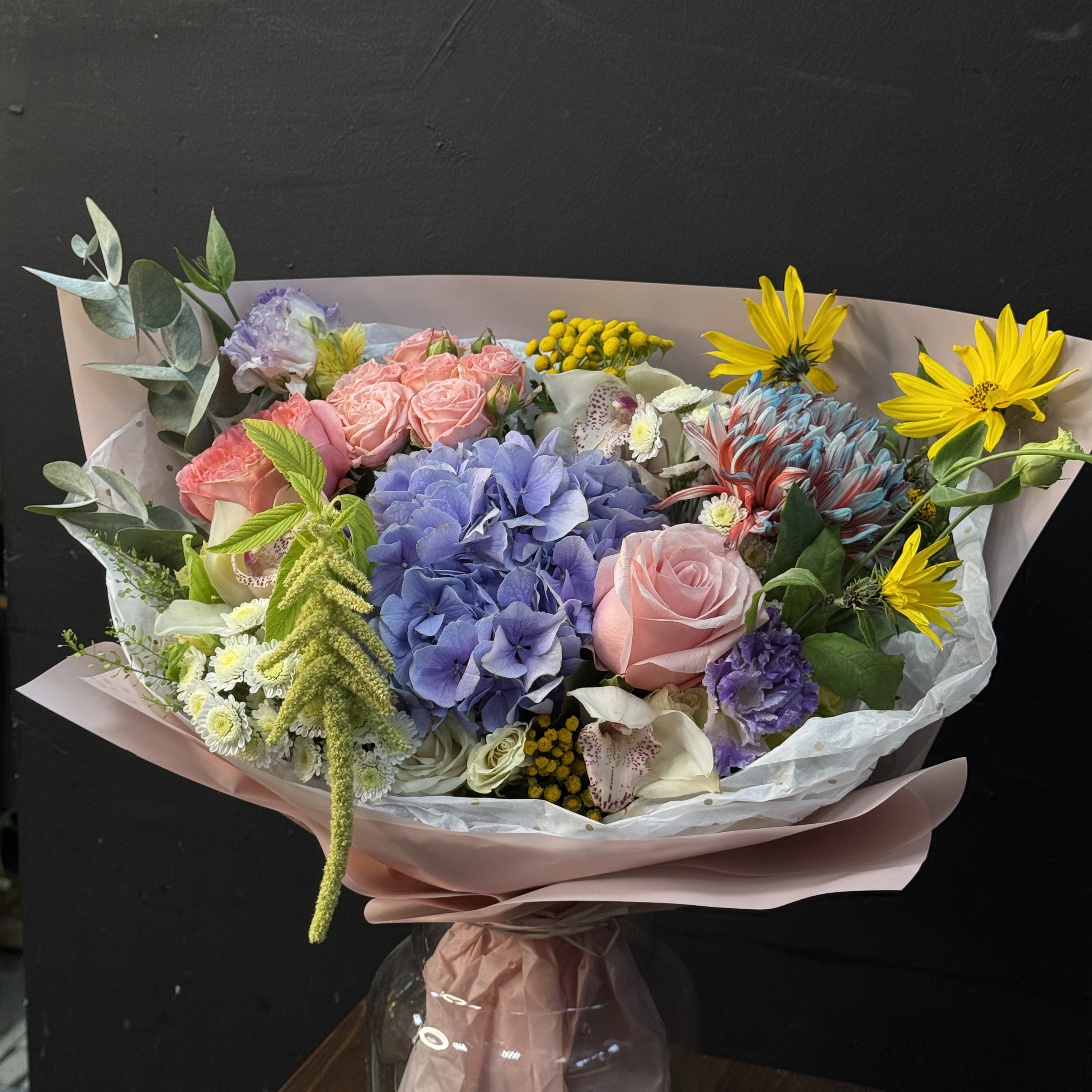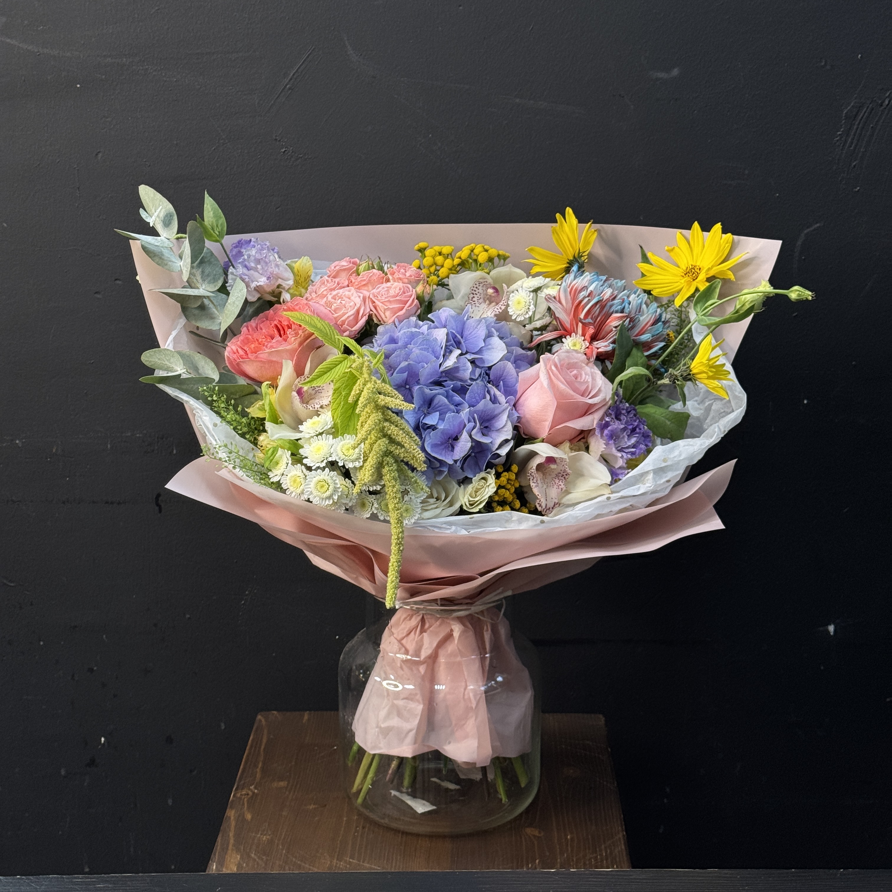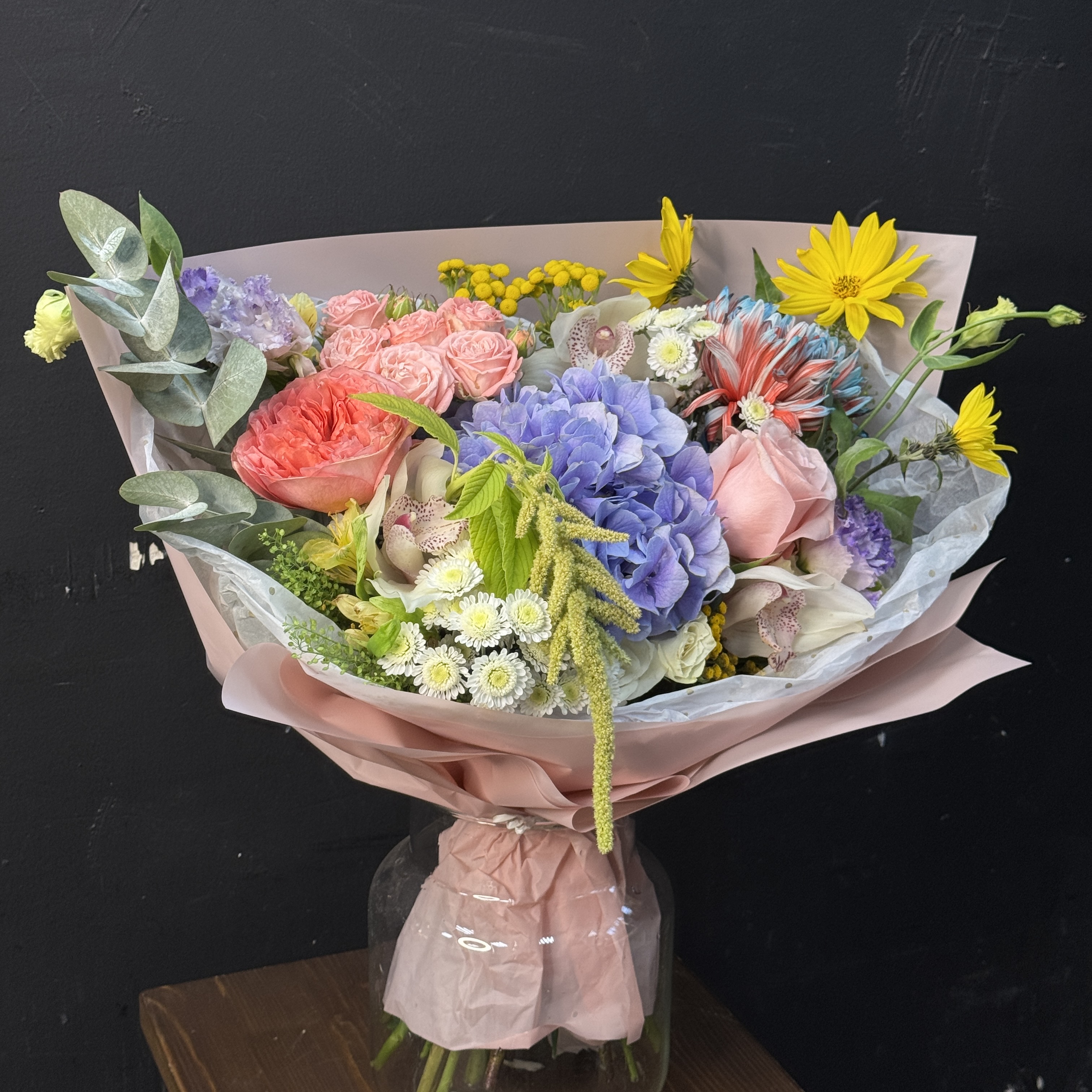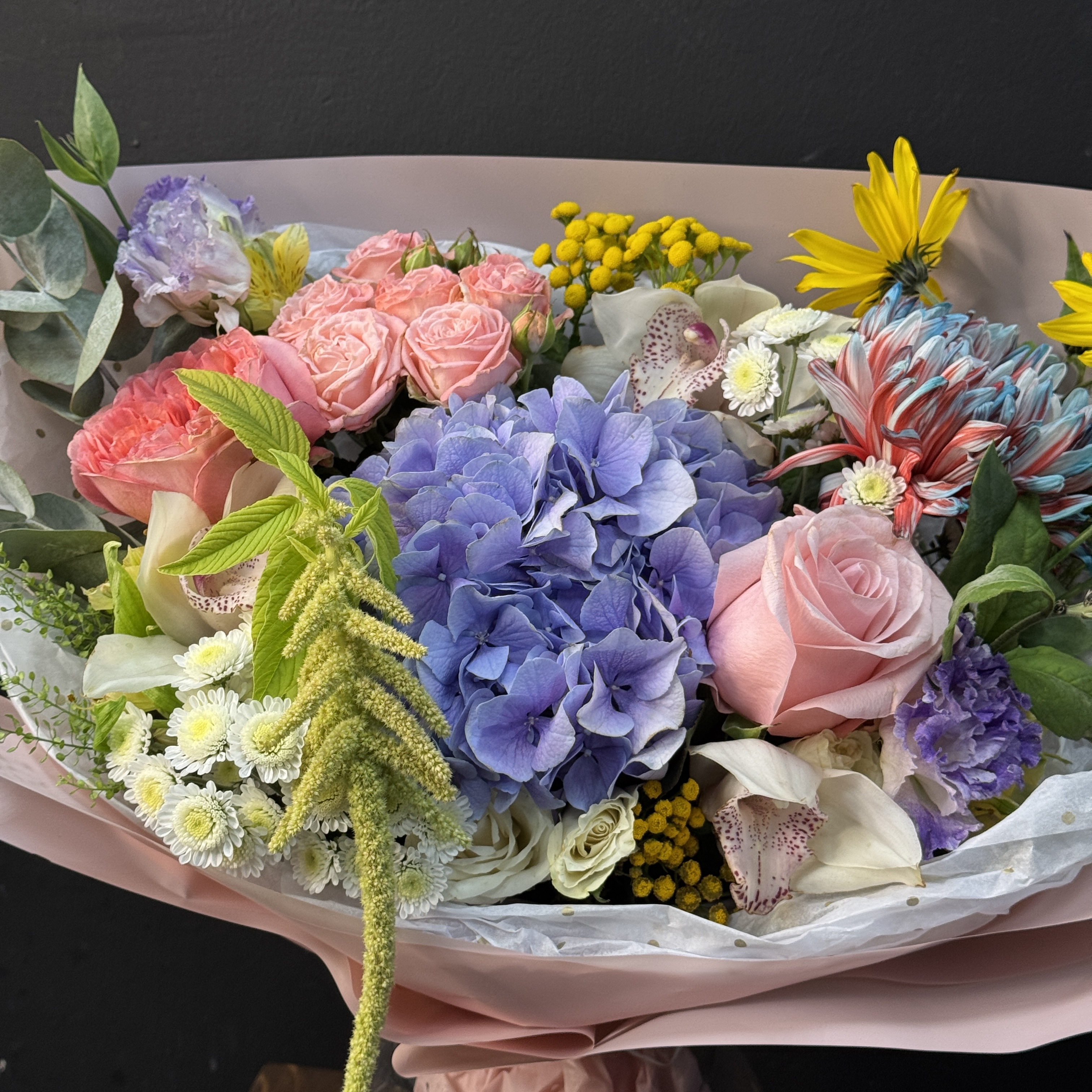 Подарите близким красоту природы с букетом из гортензии, нежных роз и экзотических орхидей! Элегантное сочетание оттенков подчеркнет индивидуальность получателя, создавая атмосферу романтики и утонченности. Прекрасно подойдет для особого случая — дня рождения, юбилея, признания в чувствах или просто как знак внимания. Качество и свежесть цветов гарантированы – ваш букет произведёт незабываемое впечатление!