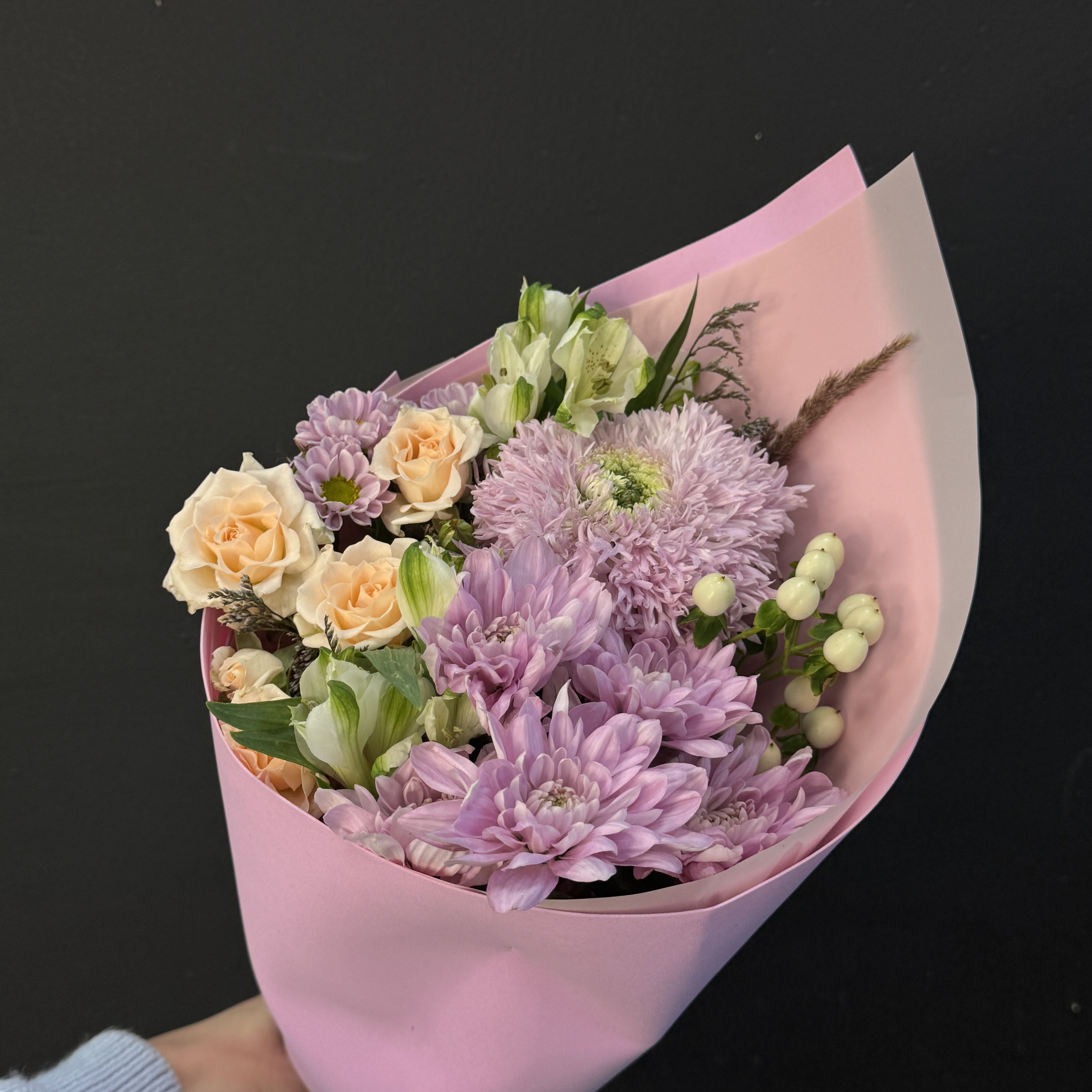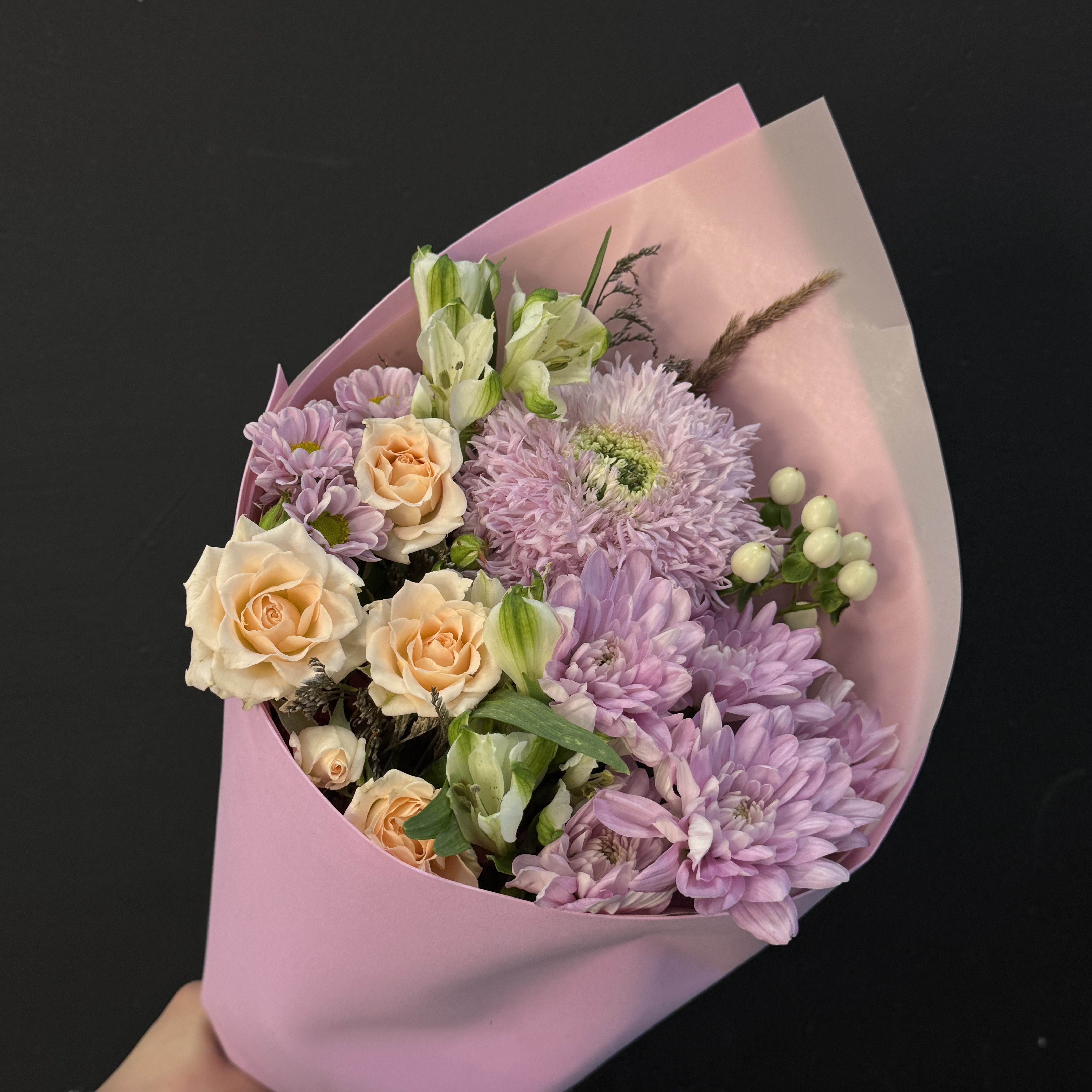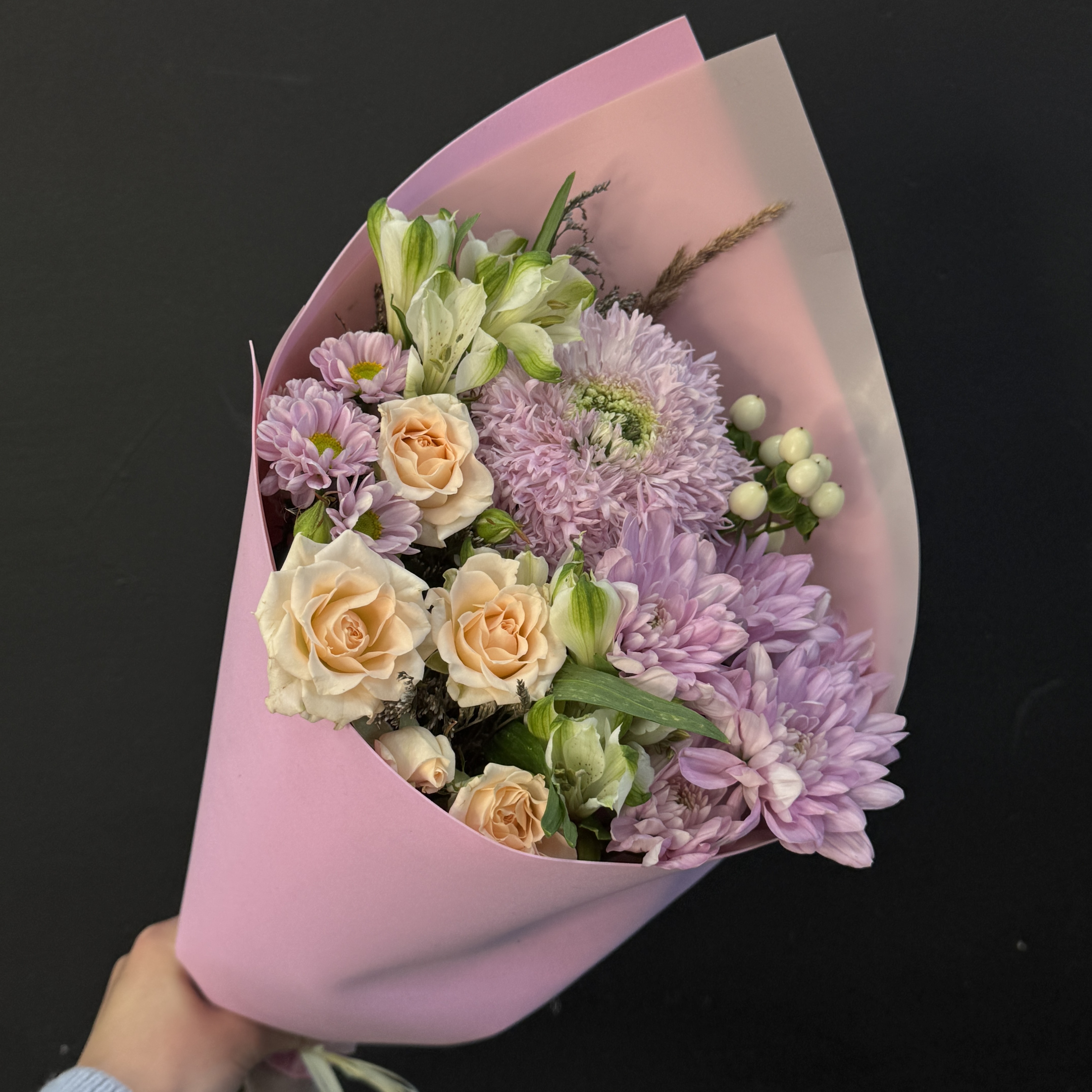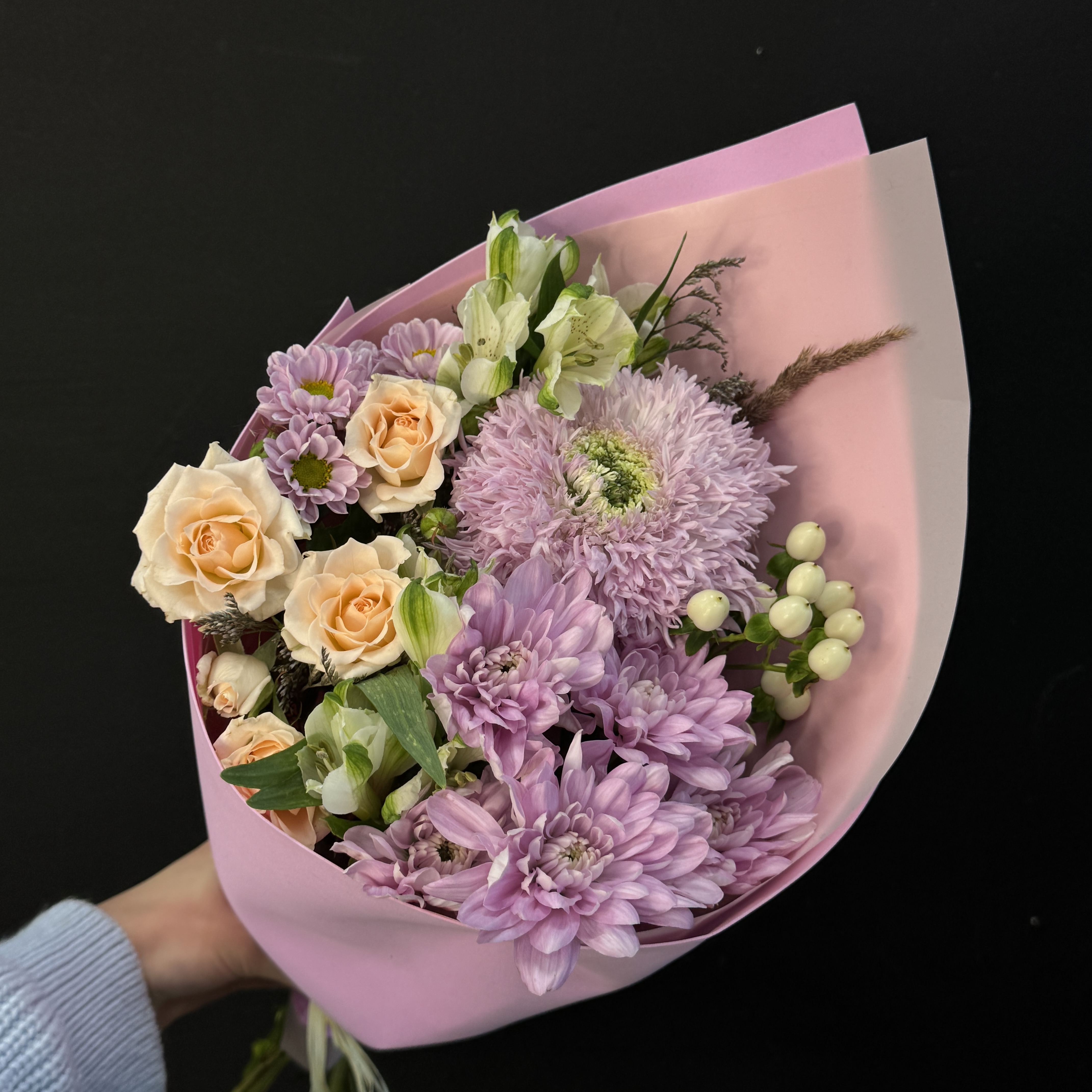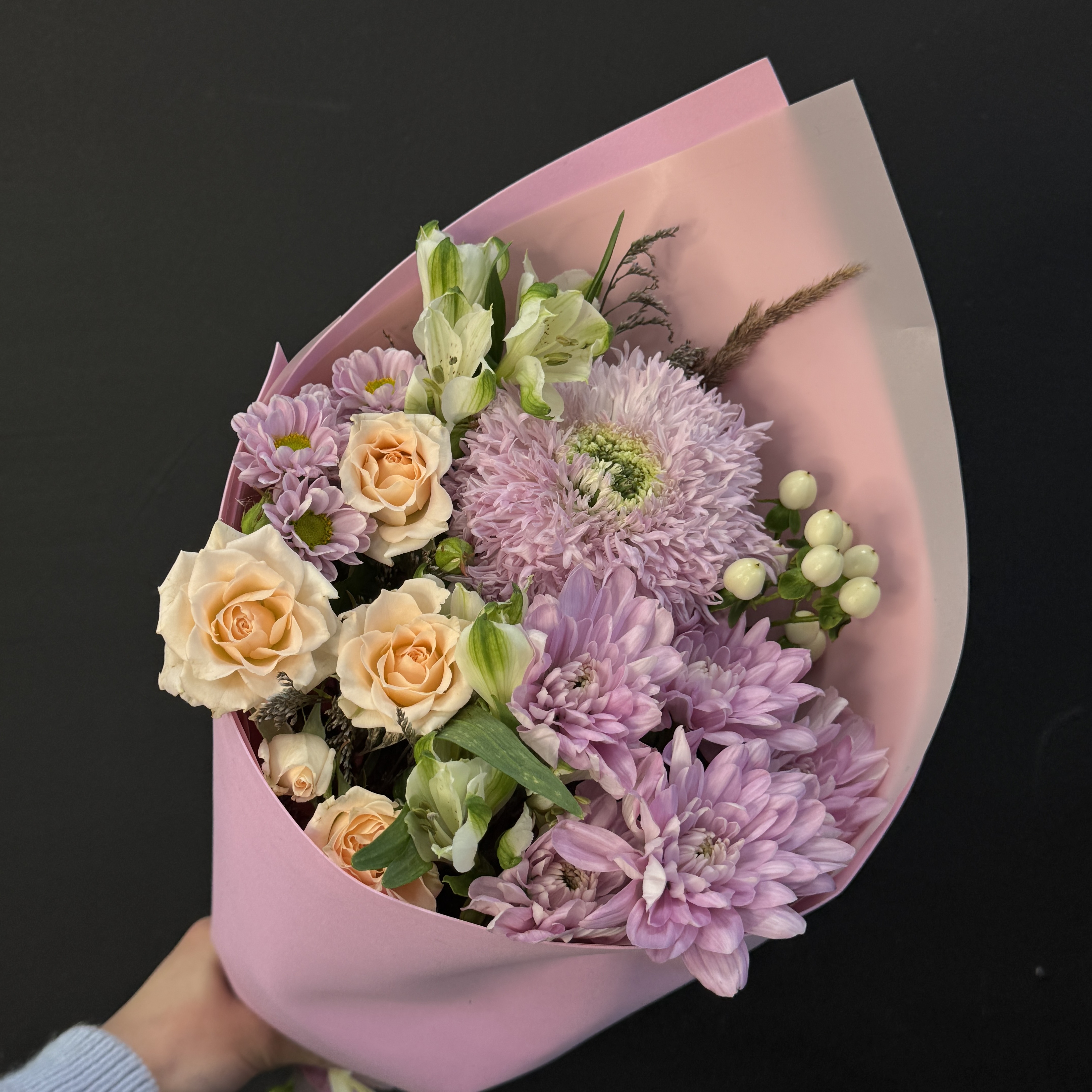 Подарите близким красоту природы! Этот букет очарует гармонией нежных оттенков хризантем, утонченностью кустовых роз и изящностью альстромерий. Отличное решение для Дня рождения, юбилея или романтического свидания. Доставим ваше послание любви и тепла прямо к дверям адресата – быстро, аккуратно и с душой. Подарок, который радует глаз и греет душу!