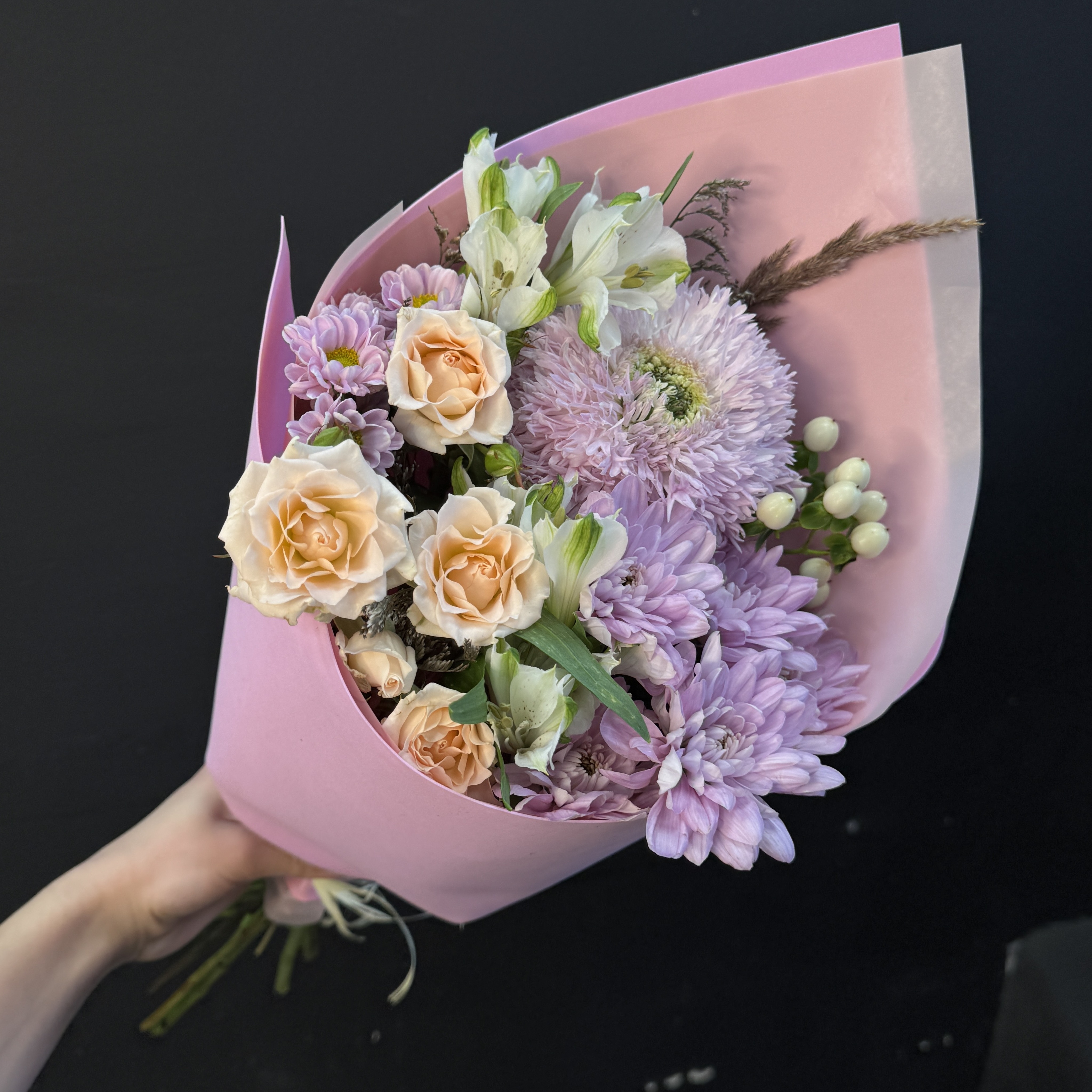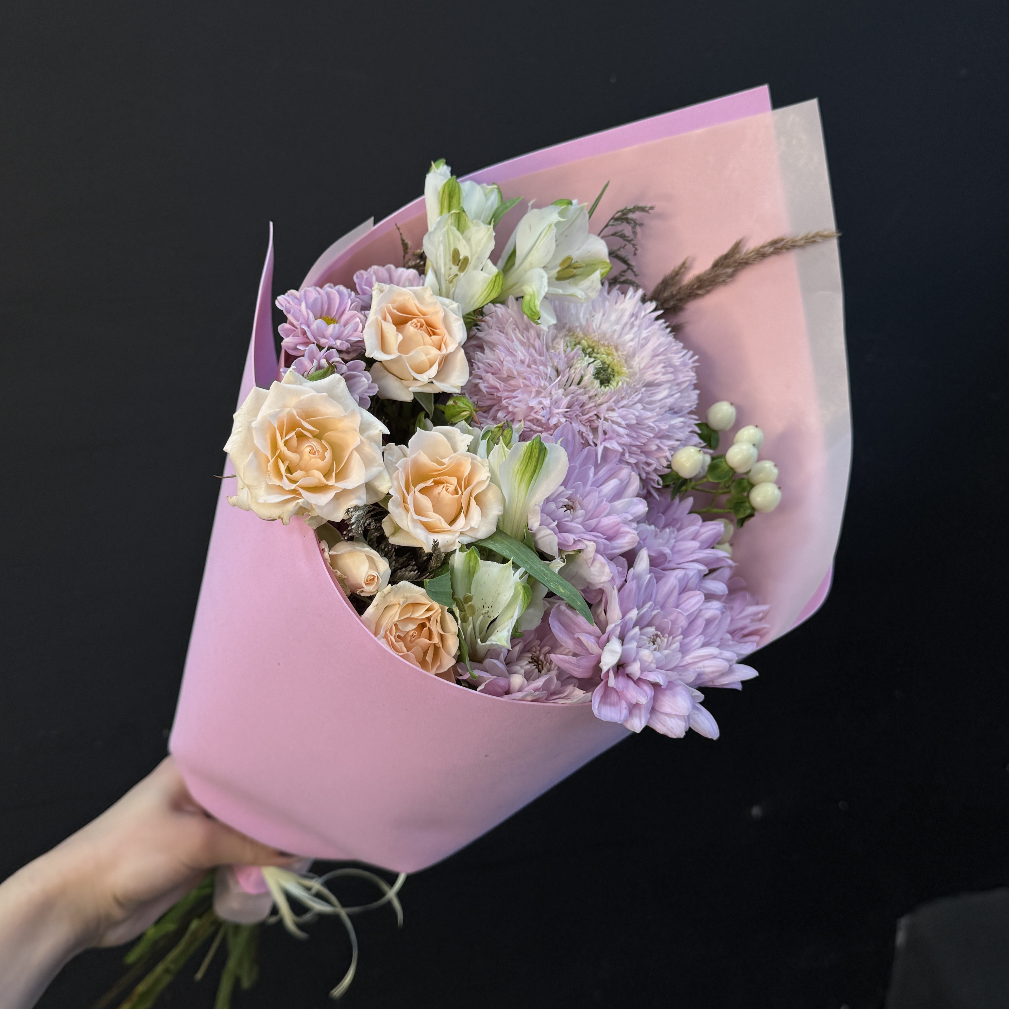 Погрузитесь в очарование нежности и элегантности нашего букета! Хризантема символизирует долголетие и тепло чувств, кустовая роза – истинную любовь и страсть, а изящная альstromерия приносит радость и надежду. Этот букет станет идеальным подарком для близких людей, подчеркнёт вашу заботу и внимание к деталям. Сделайте свой выбор в пользу искренних эмоций вместе с нами!