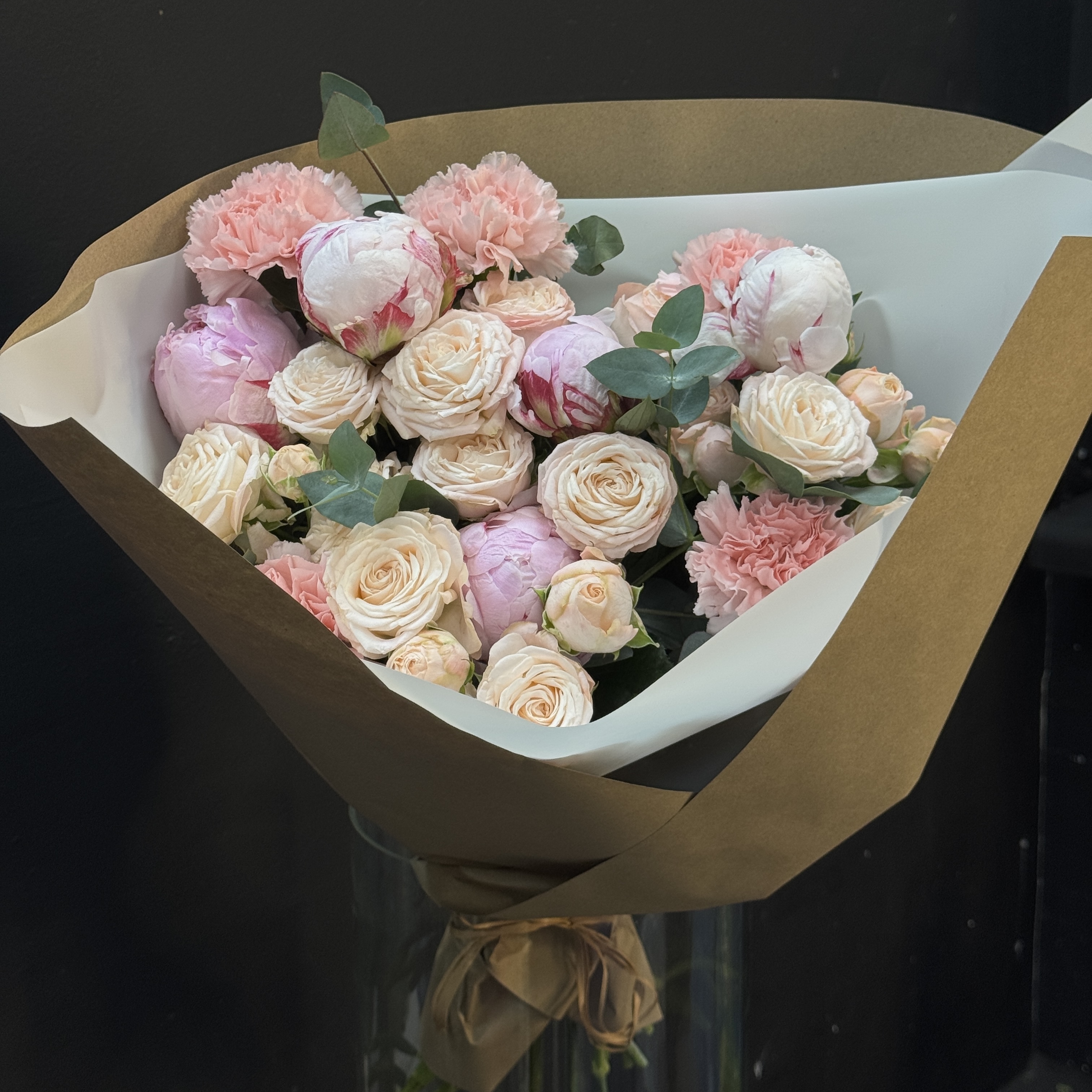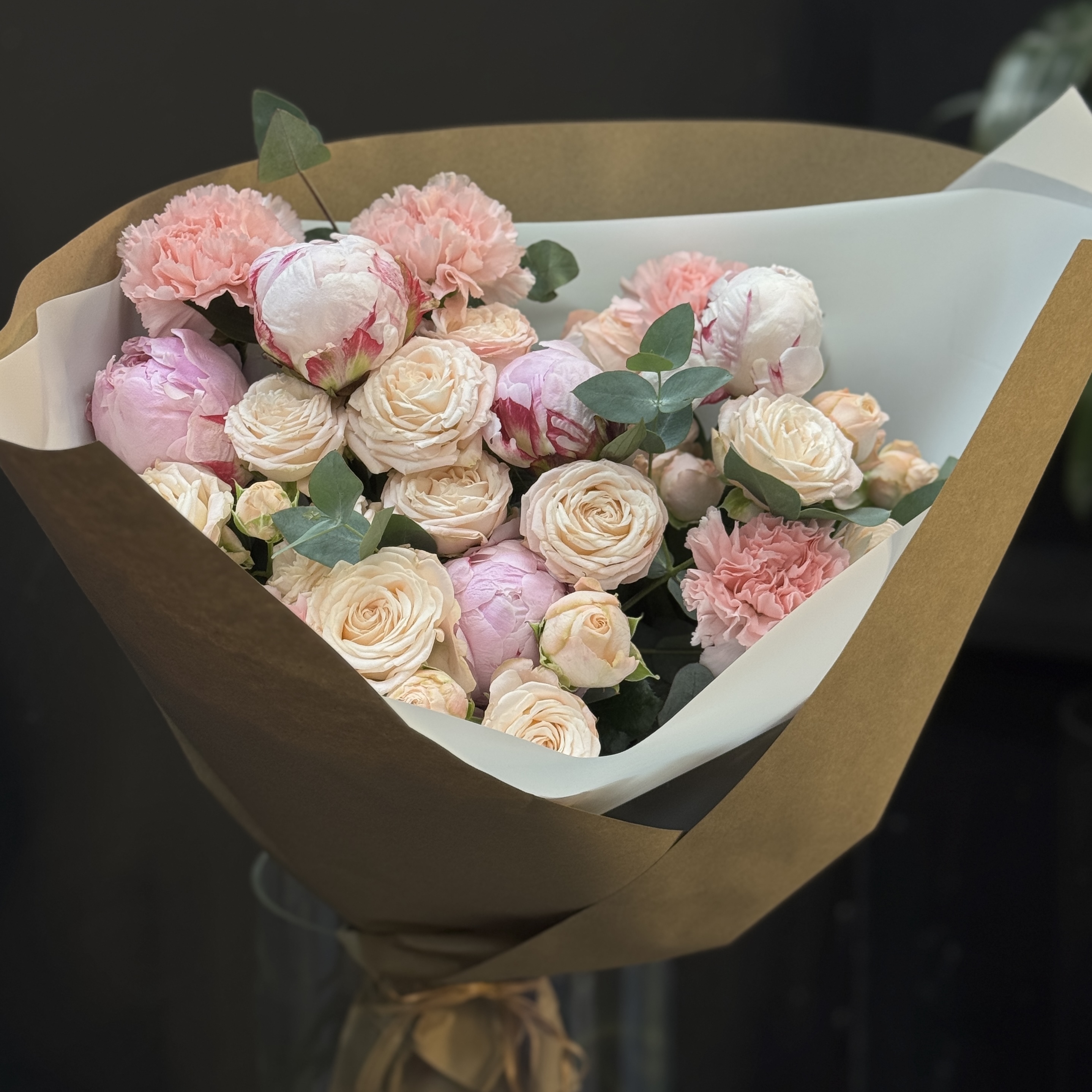 Подарите близким красоту природы! Настоящий шедевр флористики — букет из элегантных кустовых роз, нежных пионов и утонченных диантусов, упакованных в стильную крафт-бумагу. Создает атмосферу романтики и уюта, подчеркивает изысканный вкус дарителя. Идеально подойдет для любого случая: от дня рождения до признания в любви. Доставка по городу быстро и аккуратно. Пусть каждый цветок расскажет о ваших чувствах!