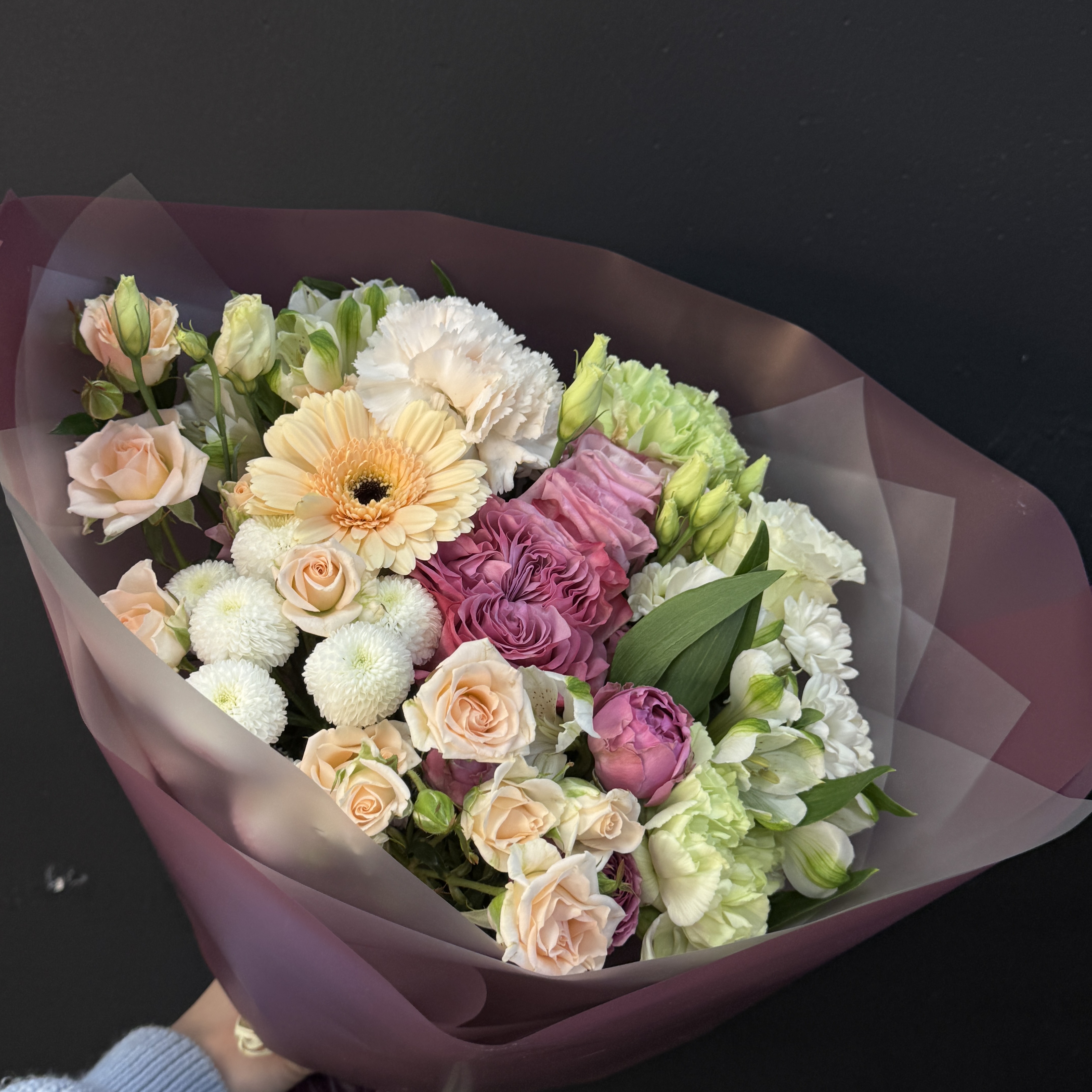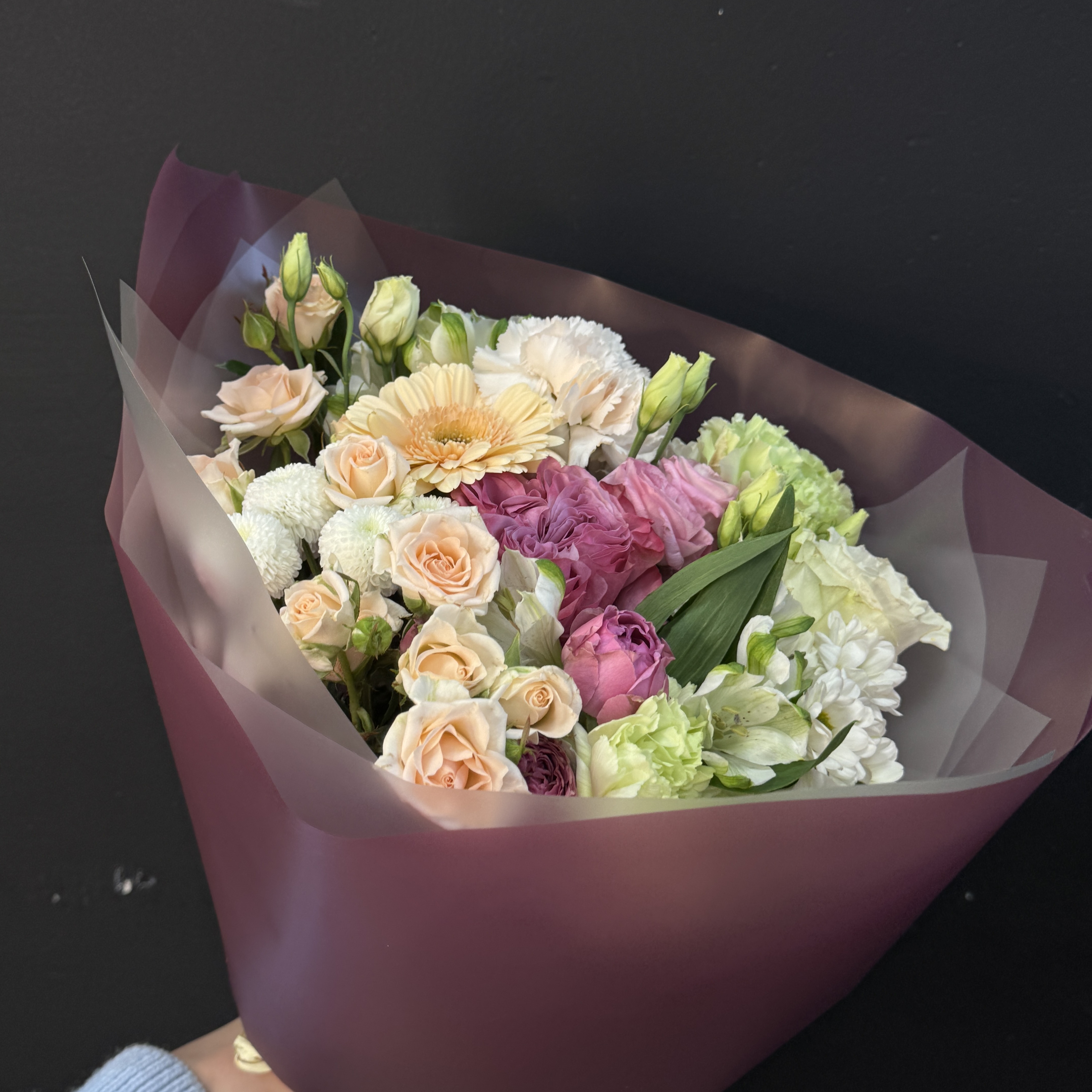 Подарите близким красоту и нежность букета, который объединяет элегантные кустовые и одноголовые розы, изящную эустому, яркую герберу, утонченные гвоздику и альстромерию! Каждая деталь этого удивительного композиции подобрана специально, чтобы дарить радость получателю. Доставьте удовольствие любимым людям, выбрав букет, способный выразить вашу заботу и чувства идеально!
