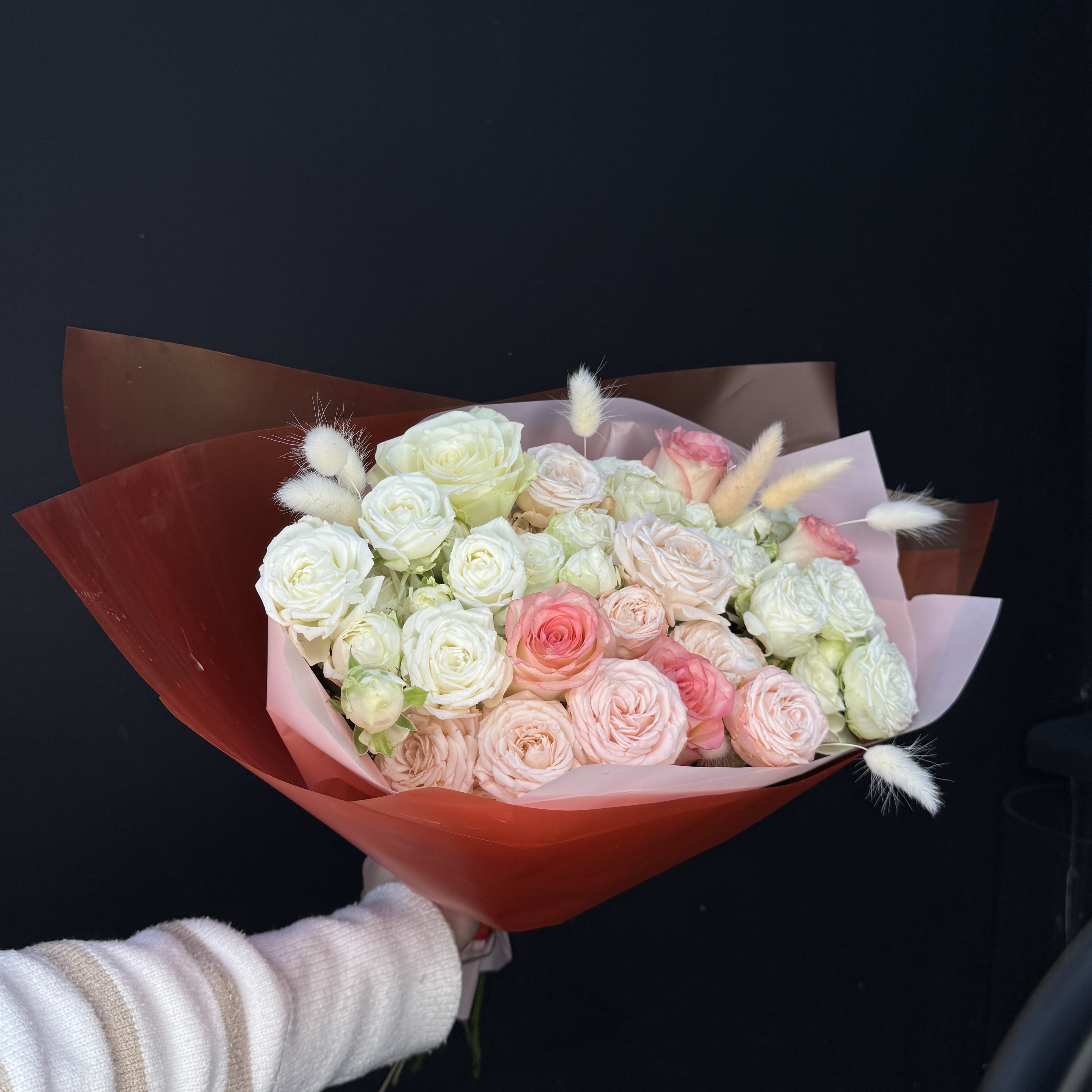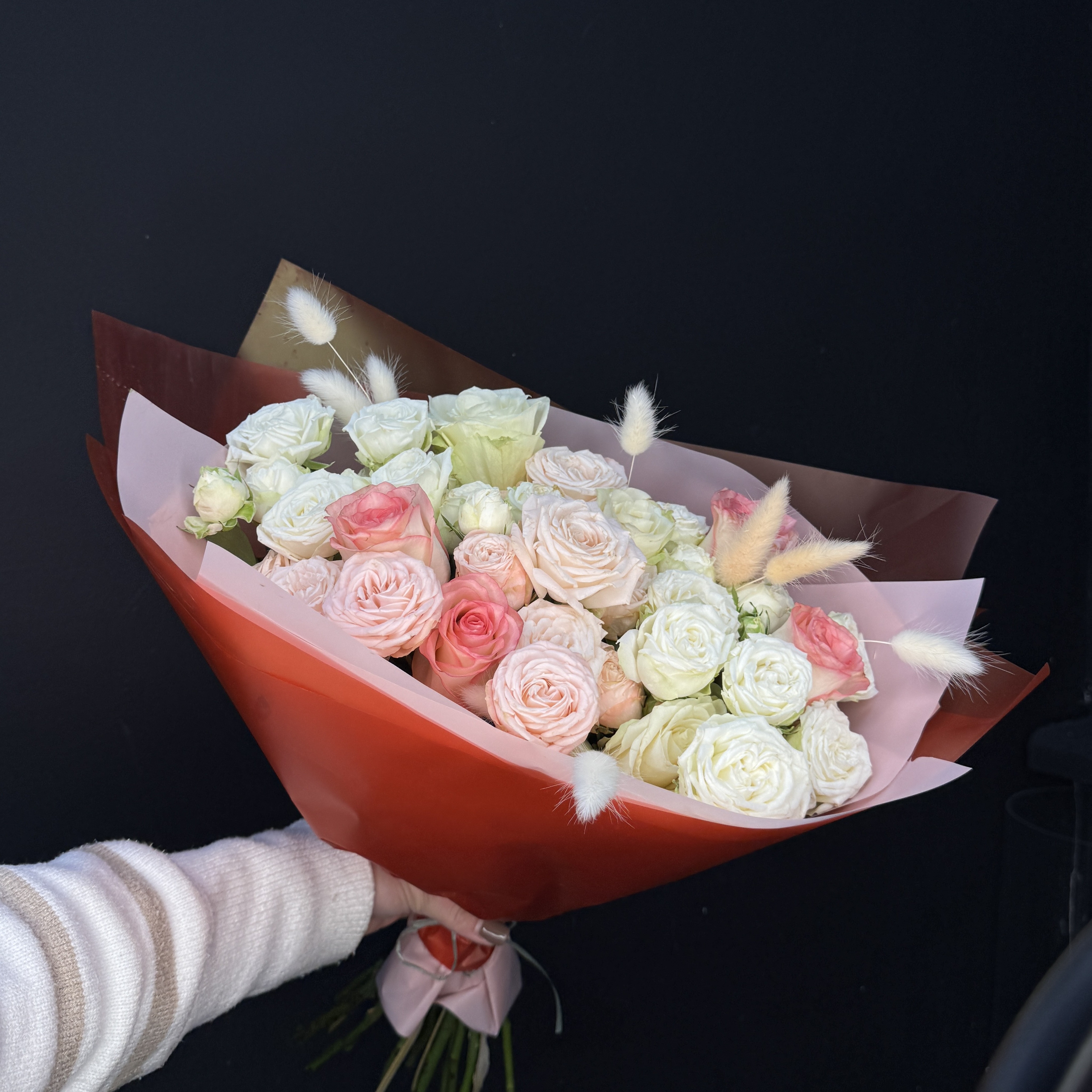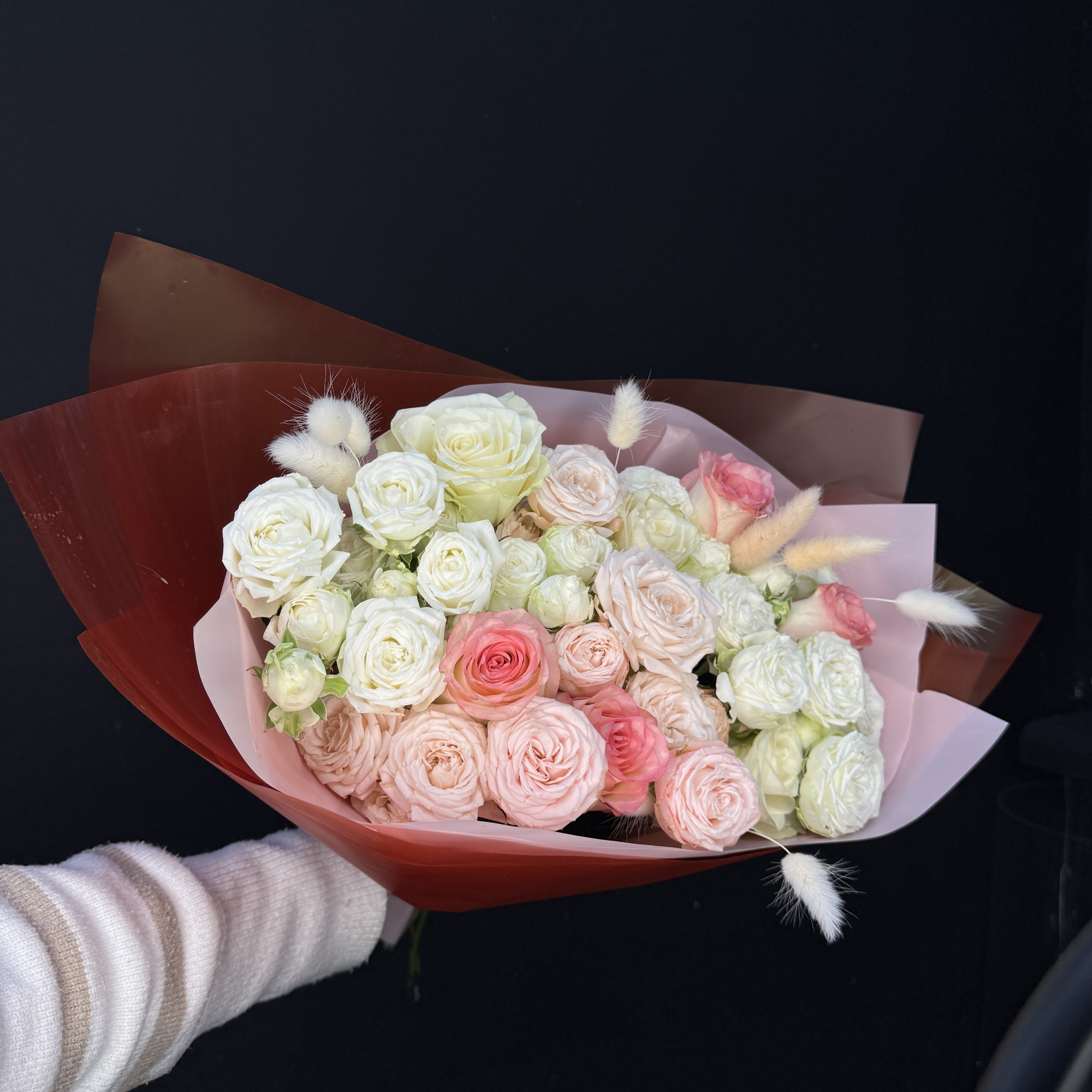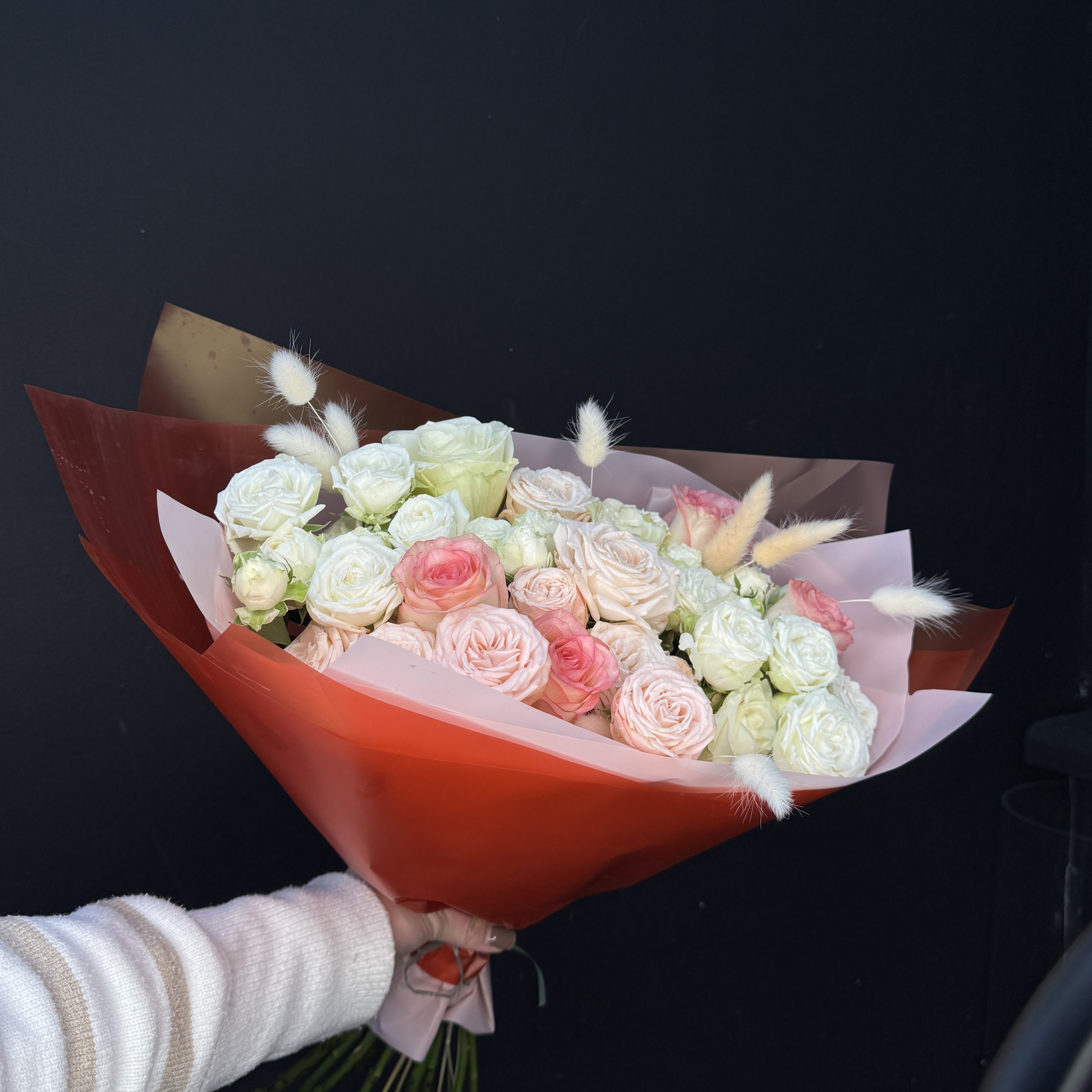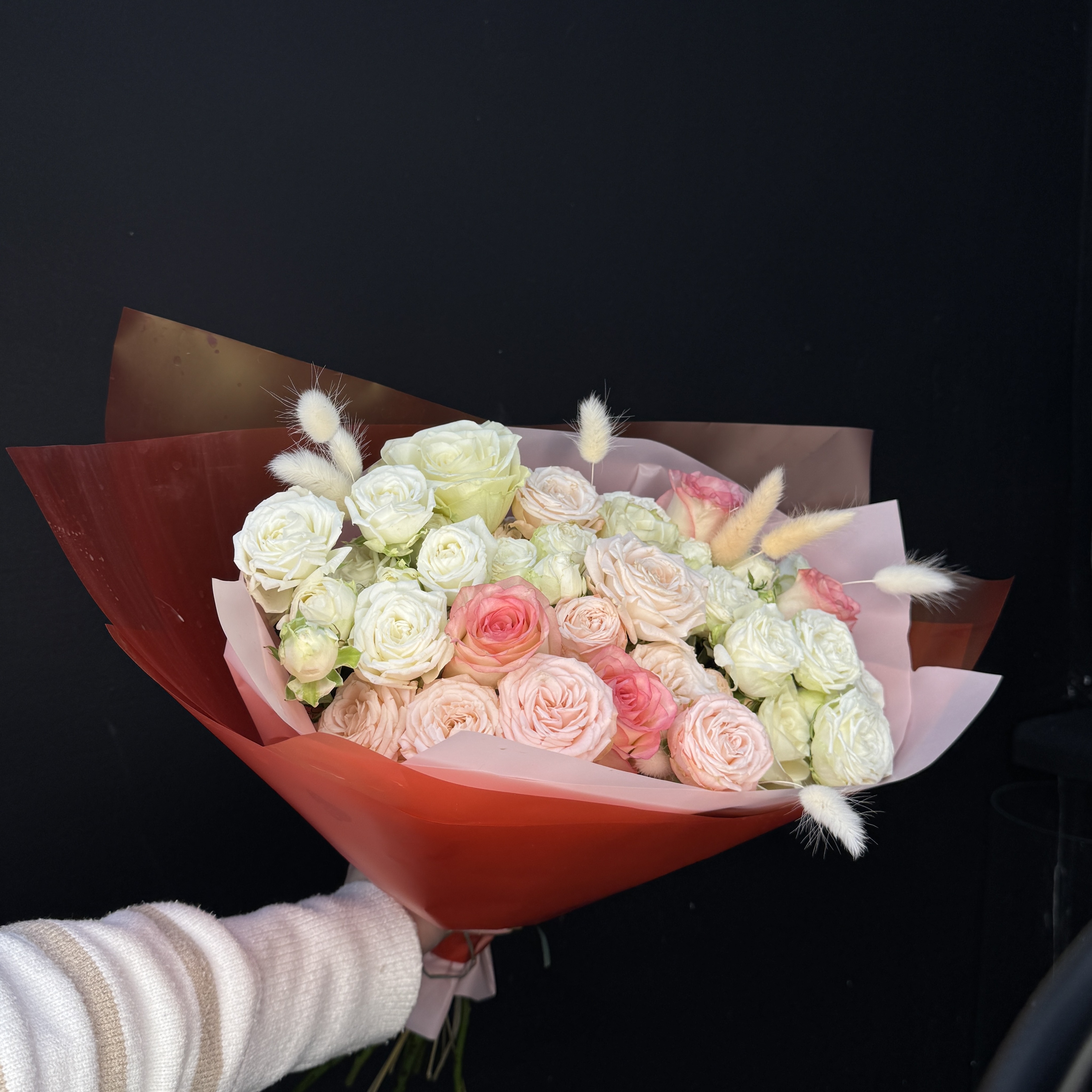 Погрузитесь в атмосферу нежности и романтики вместе с нашим уникальным букетом! Изящные розы разнообразных оттенков гармонично переплетаются с изящным лагурусом, создавая утончённый ансамбль, способный покорить сердце каждого. Это идеальный подарок по любому поводу – день рождения, юбилей, свидание или просто чтобы порадовать любимых. Пусть этот букет станет символом вашей заботы и искренних чувств!