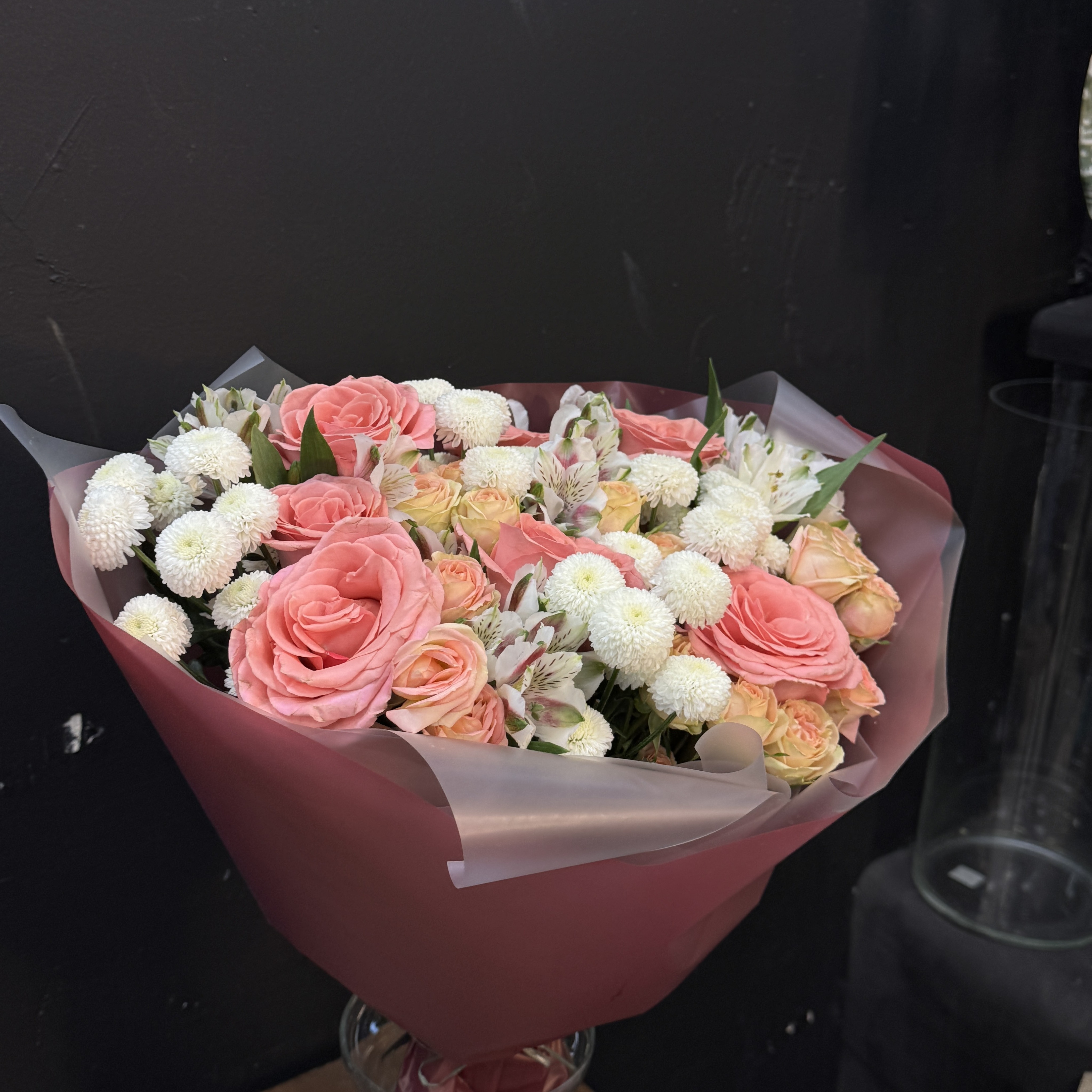 Букет из микса роз, альстромерий и сантини