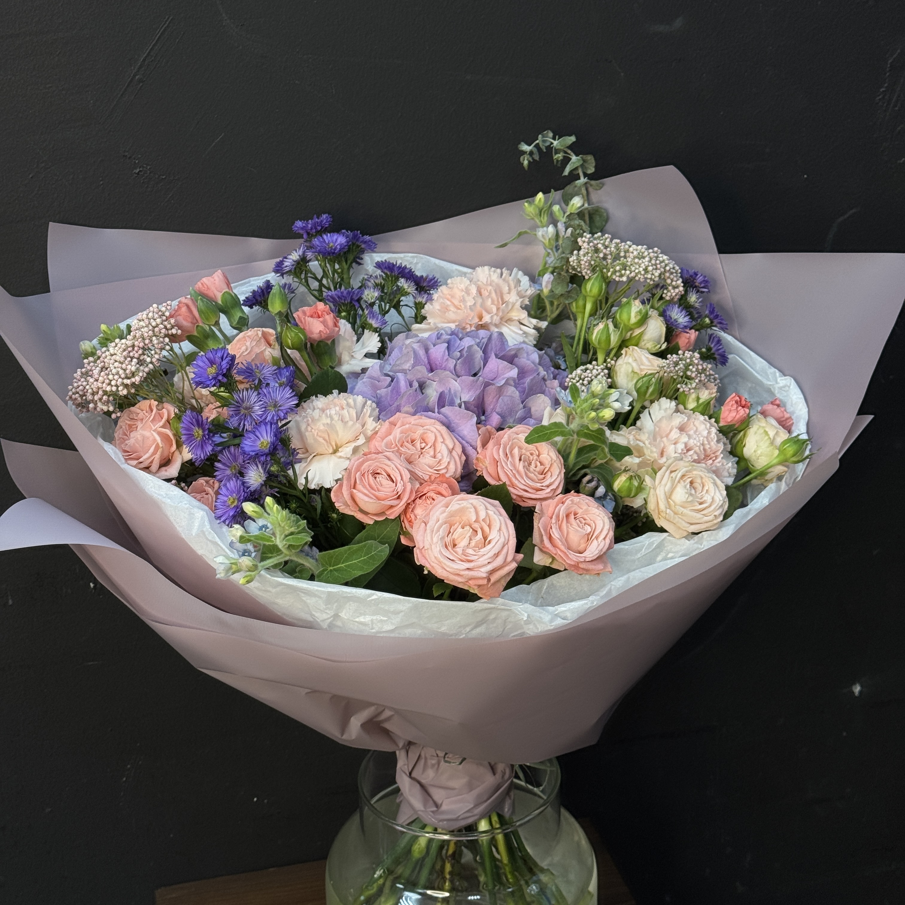 Погрузитесь в чарующую атмосферу нежности и элегантности! Наш букет — гармоничное сочетание изысканной сиреневой гортензии, утонченных кустовых роз и ярких астр. Идеальный выбор для тех, кто ценит красоту и внимание к деталям. Подчеркните индивидуальность подарка, подарите близким радость и восхищение! Доставка по городу быстро и аккуратно. Пусть каждый лепесток расскажет о ваших чувствах!