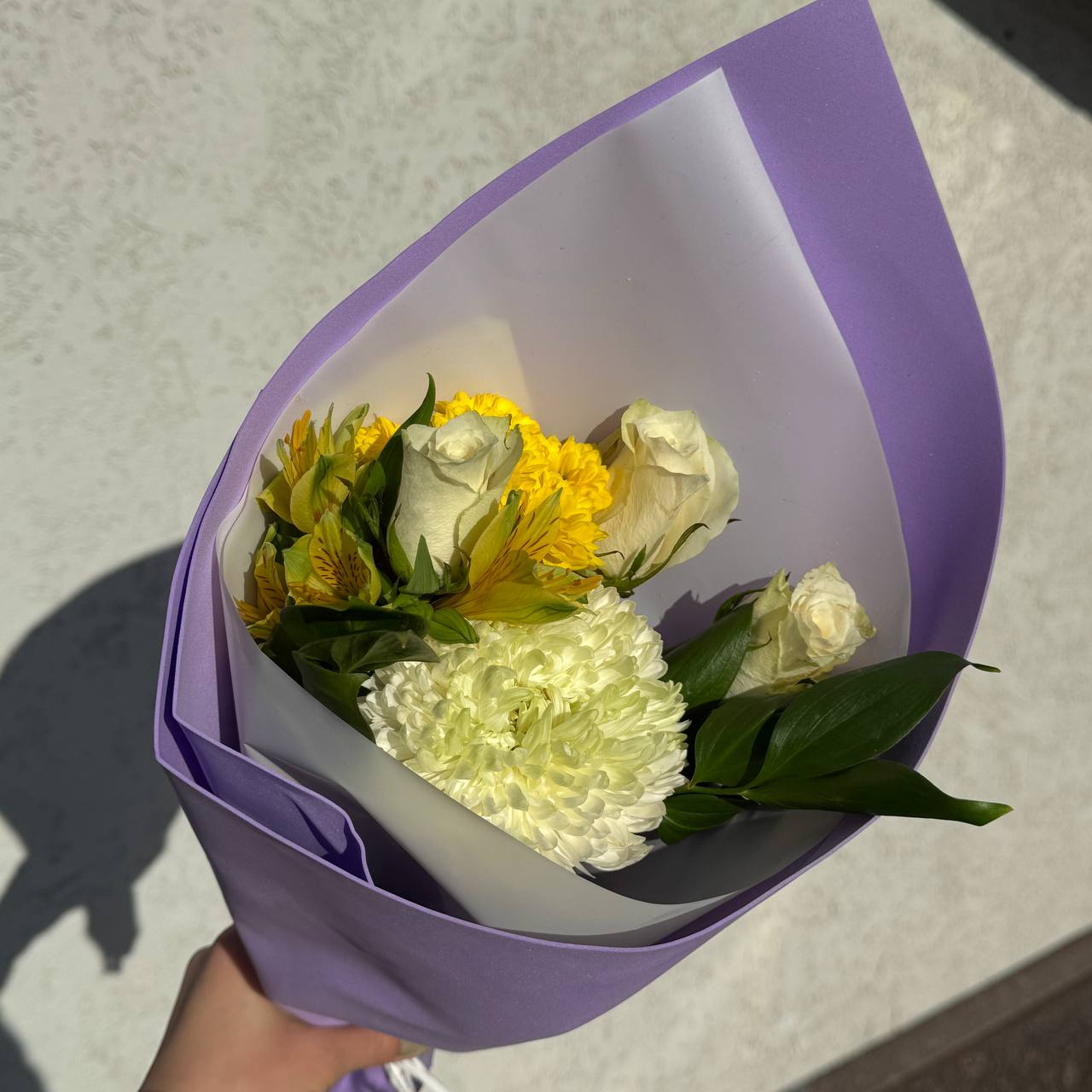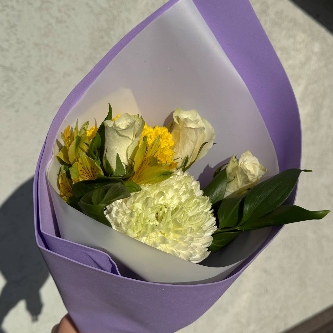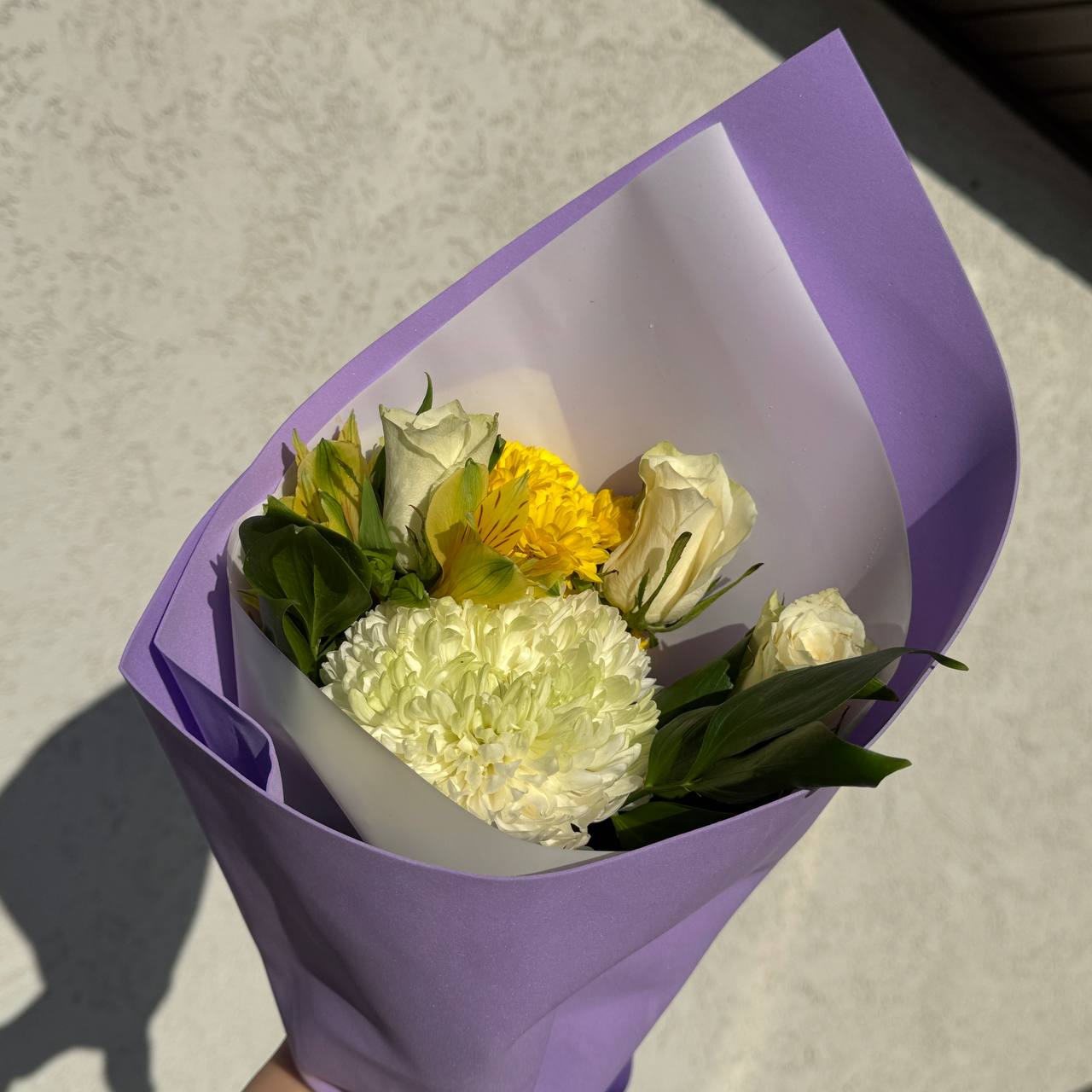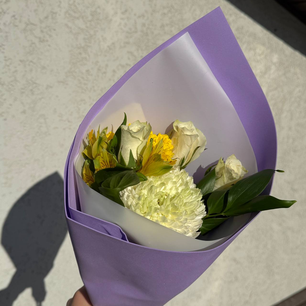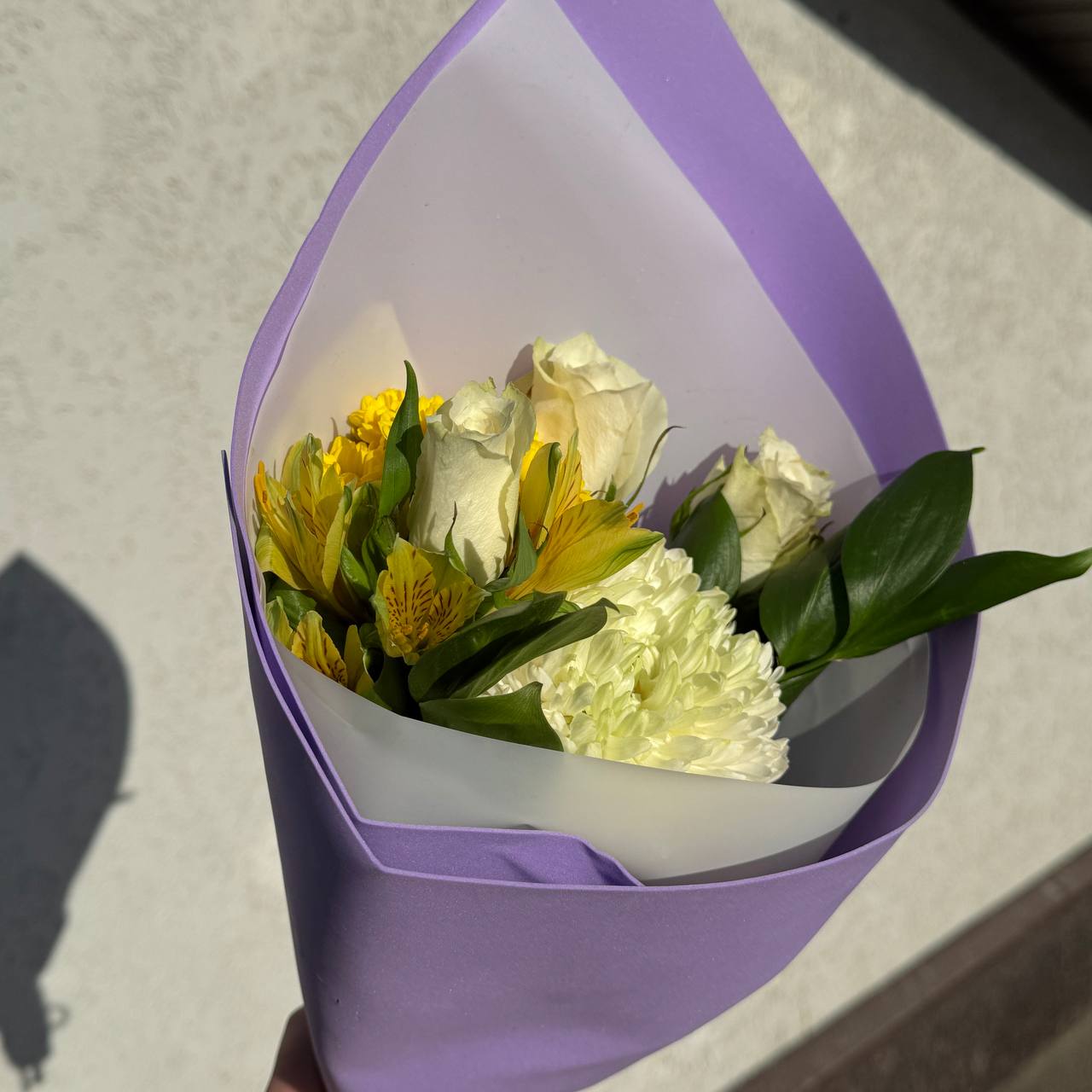 Такой небольшой букет цветов станет отличным выбором, если вам нужен презент для девушки, мамы, коллеги или подруги.