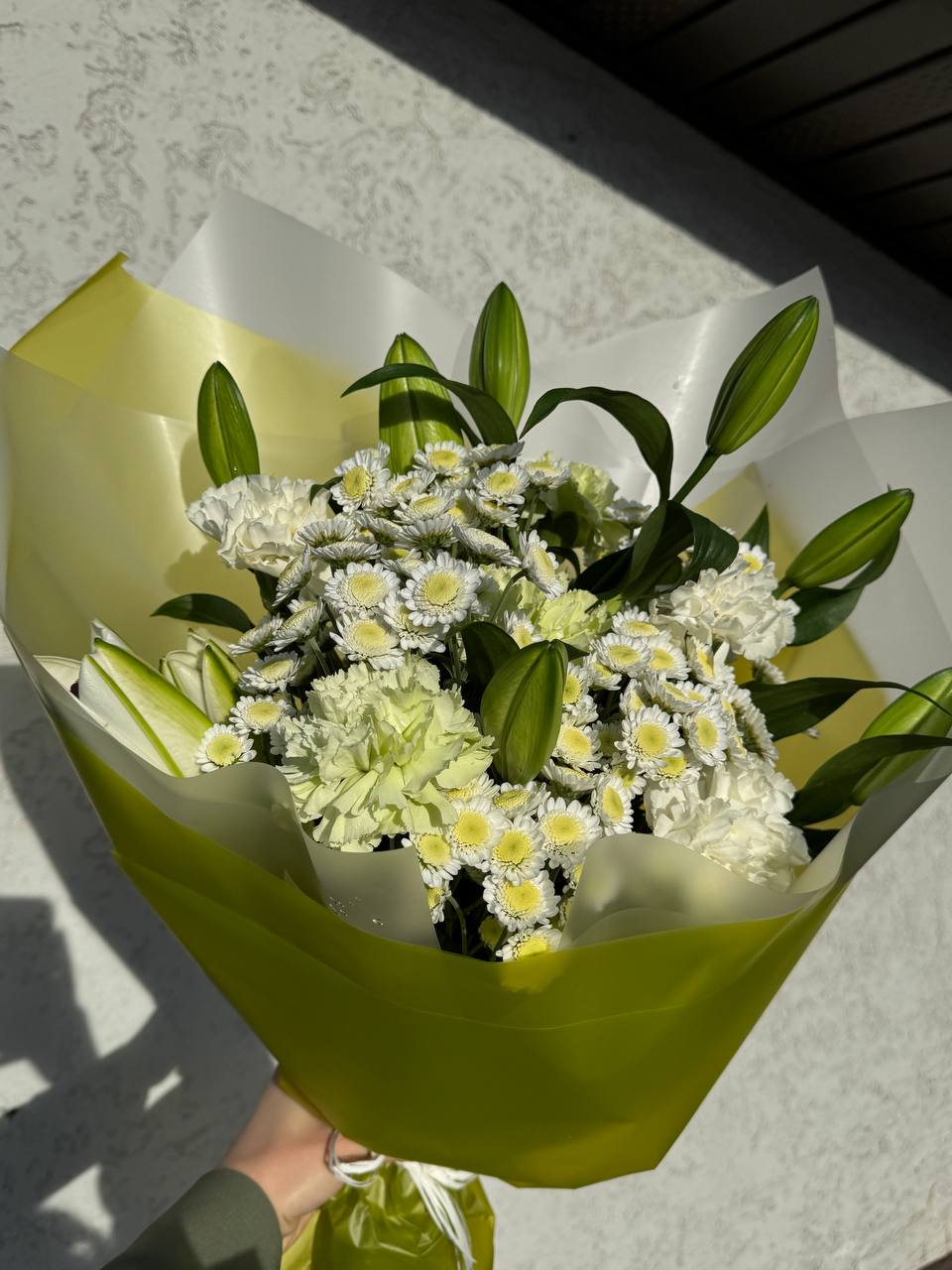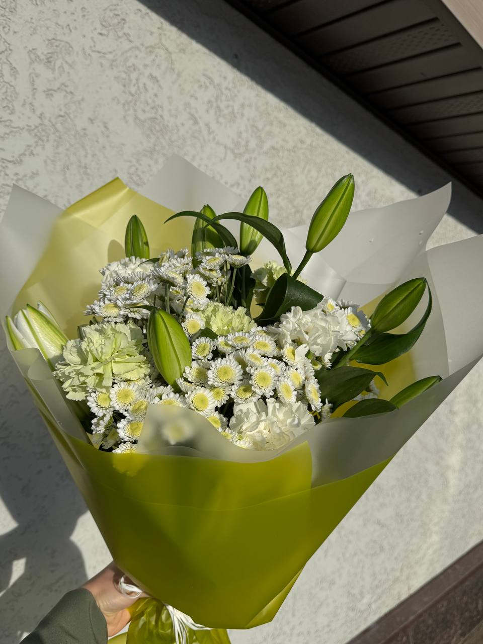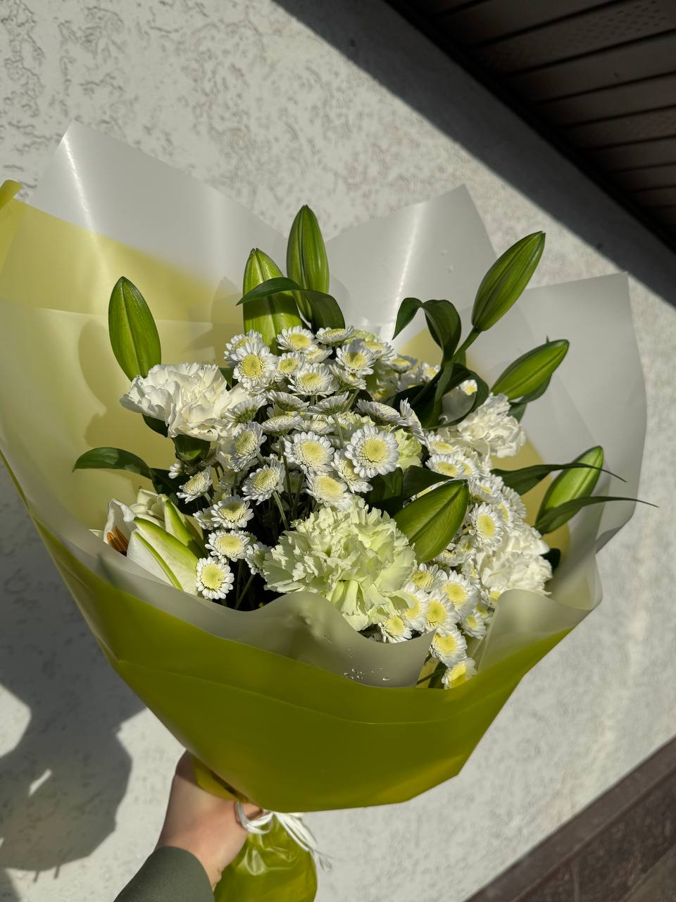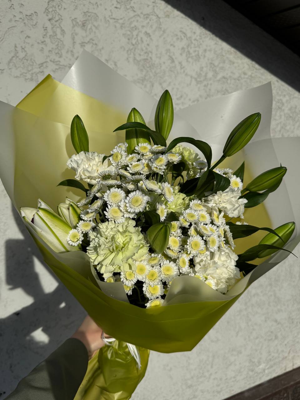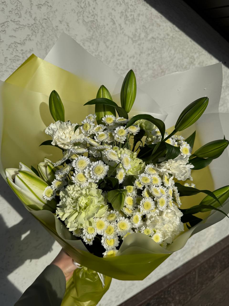 Элегантный букет в нежно-белой гамме. Лилии в бутонах символизируют чистоту и утонченность, белые гвоздики добавляют воздушности, а кустовые хризантемы придают композиции объем и свежесть. Декоративная зелень гармонично завершает букет.