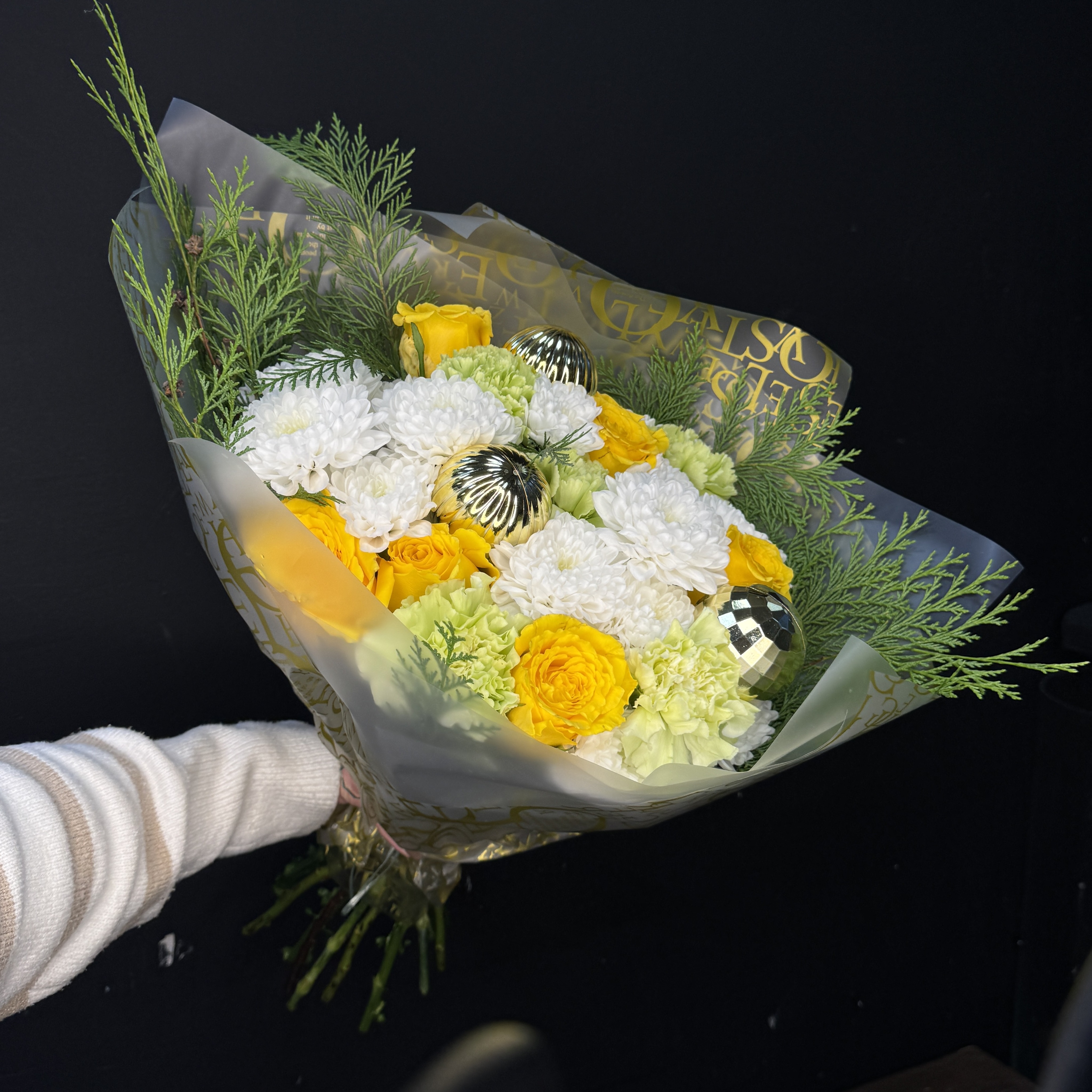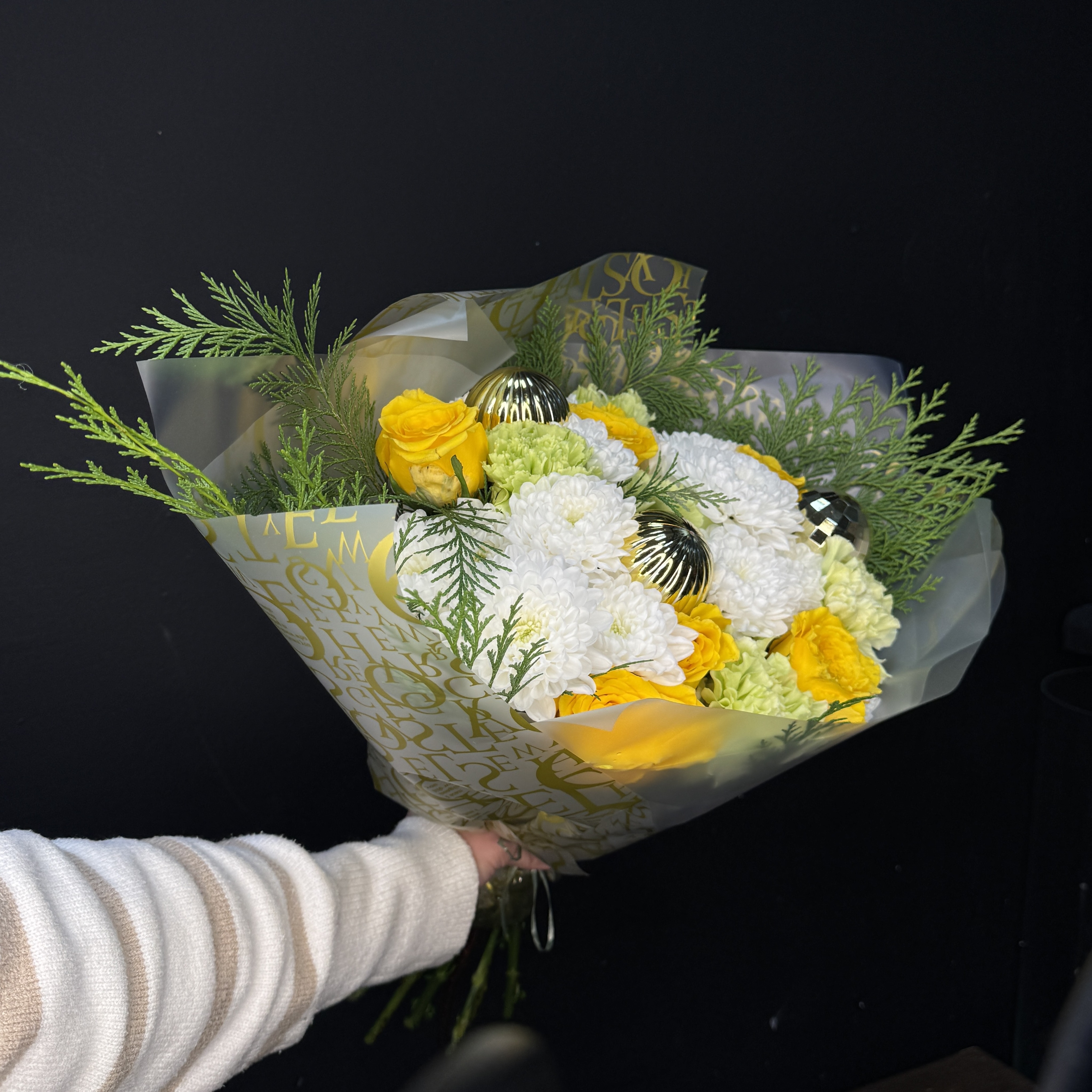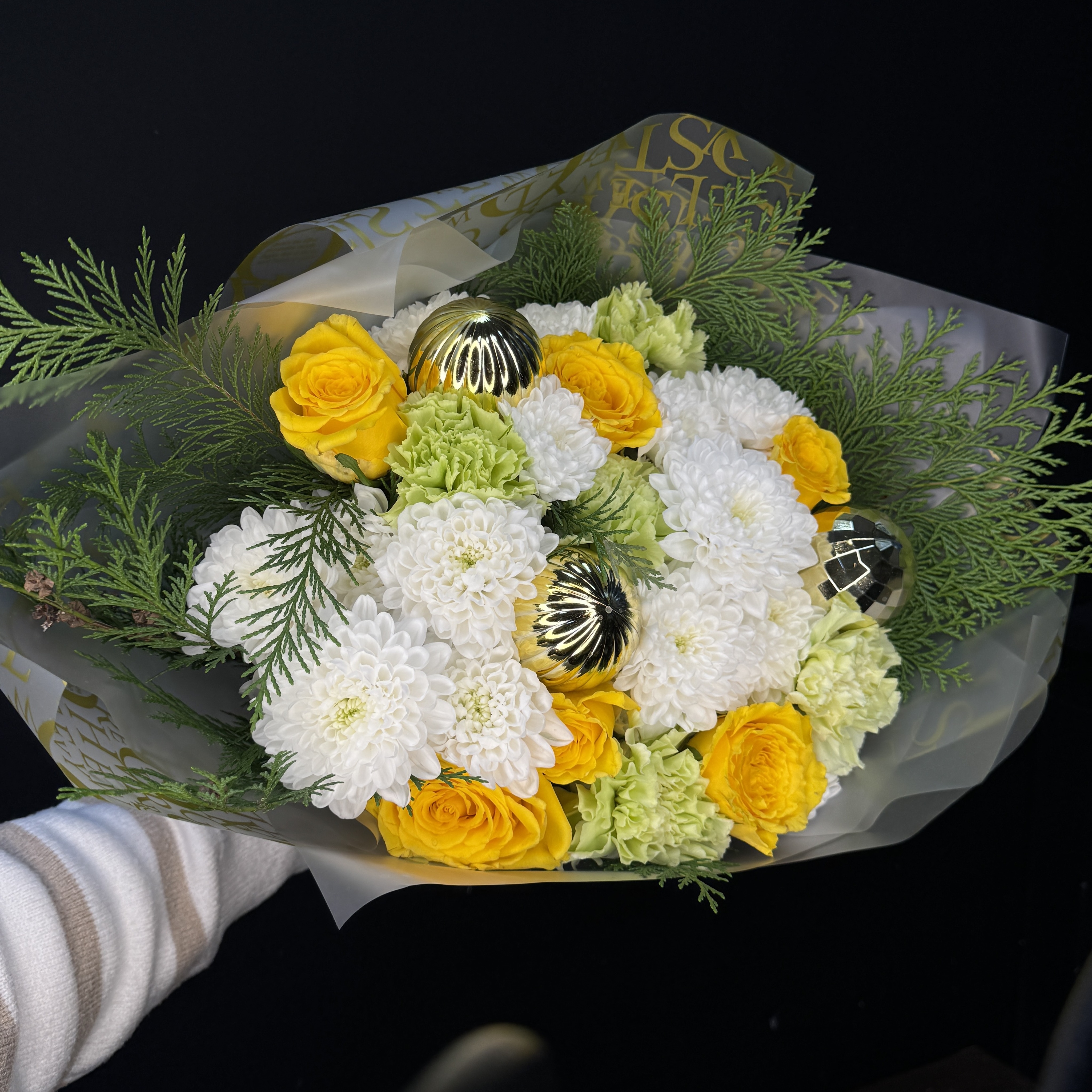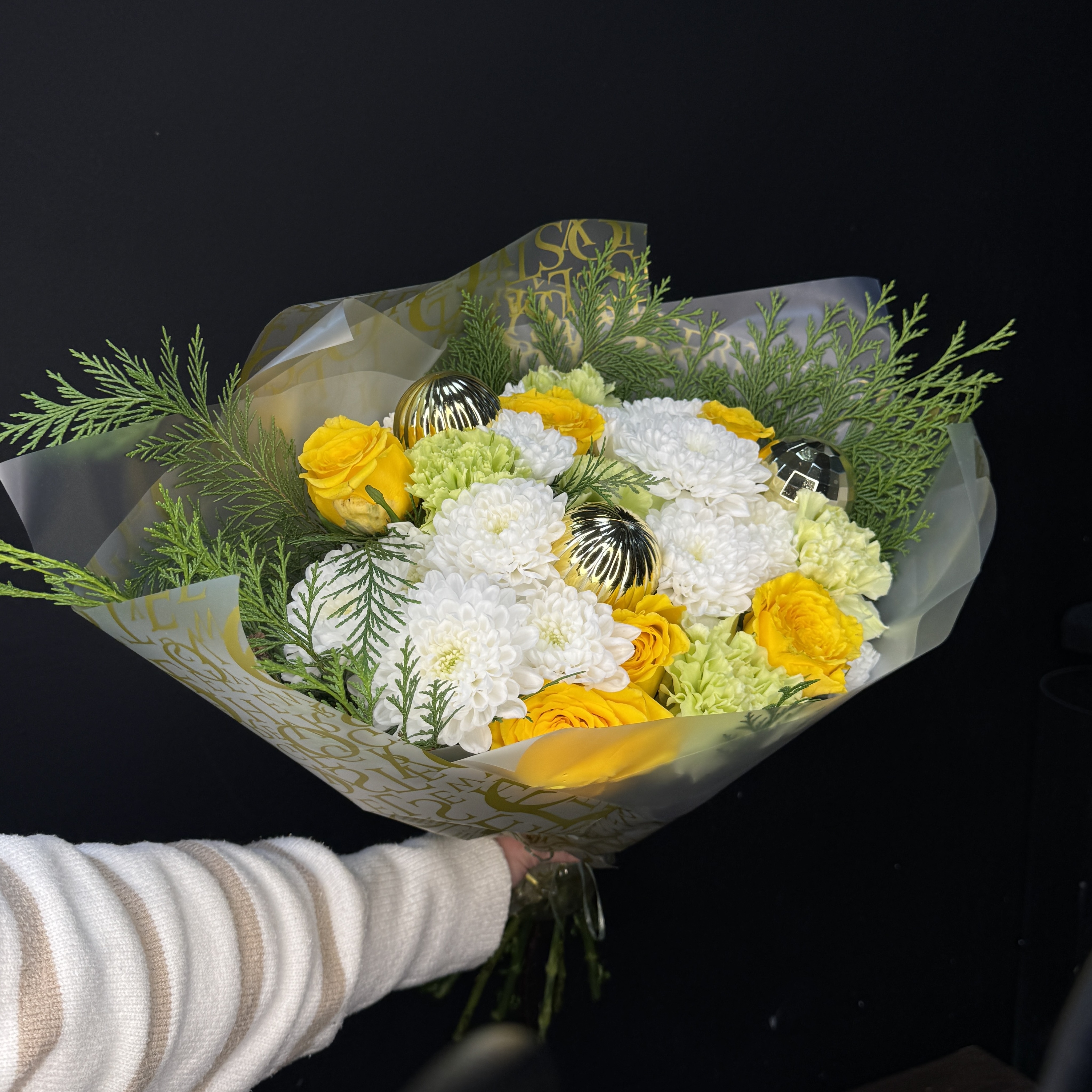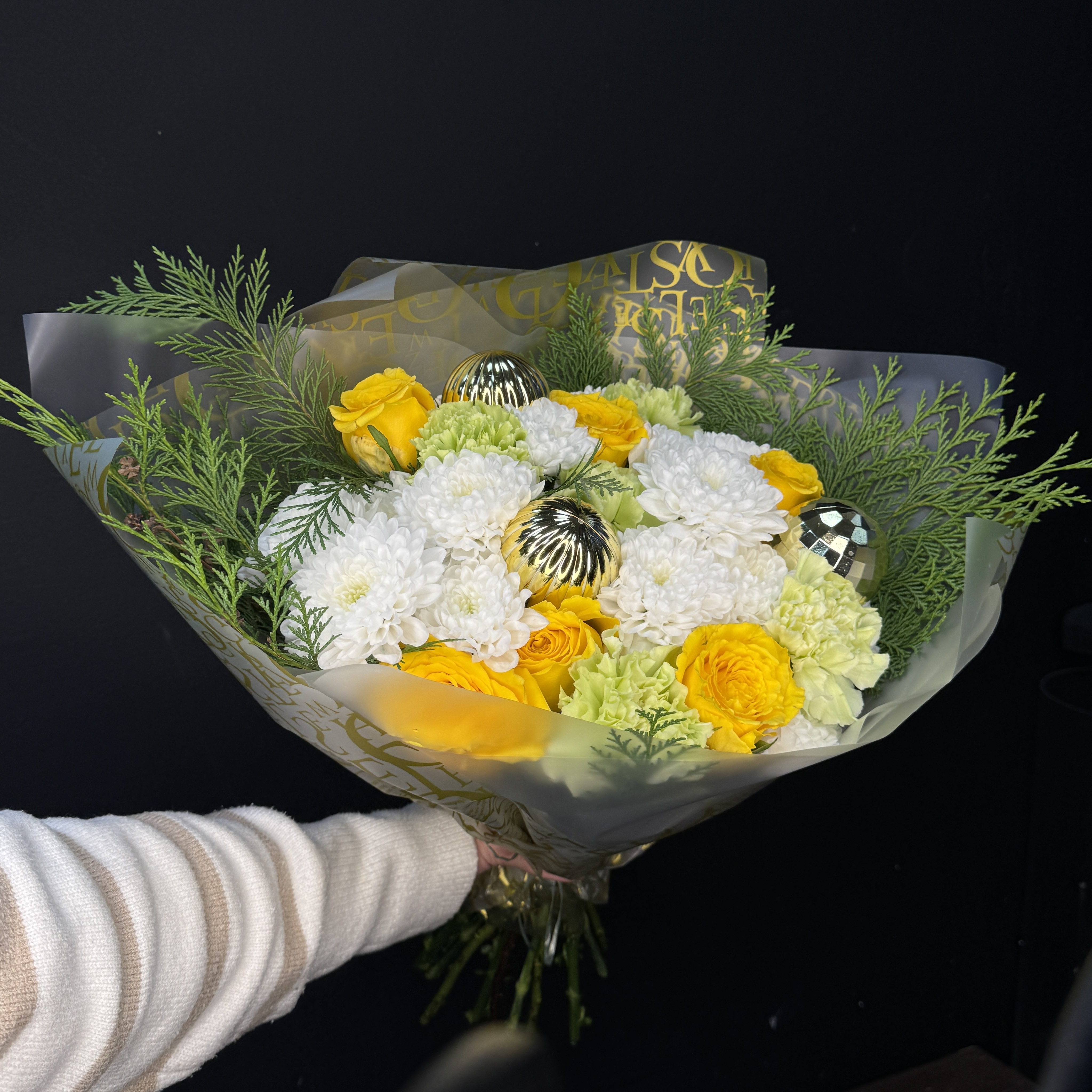 Букет с новогодними шариками, хризантемой и розами