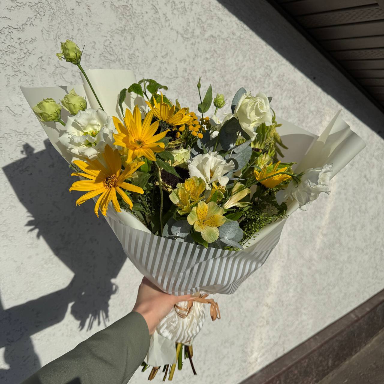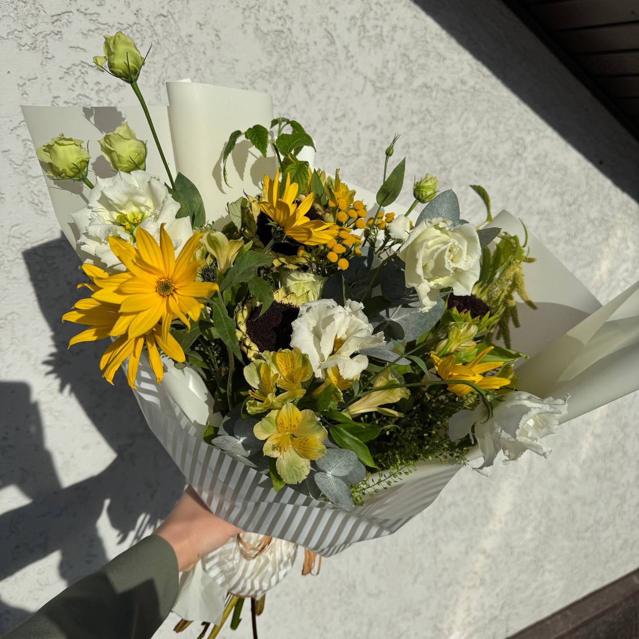 Яркий и стильный букет, наполненный солнечным настроением и лёгкостью. Золотистые подсолнухи и топинамбур создают радостный акцент, эустома и альстромерия придают композиции нежность, а эвкалипт и амарант добавляют свежести и оригинальности. Декоративная малина и пижма делают букет ещё более уникальным и запоминающимся.