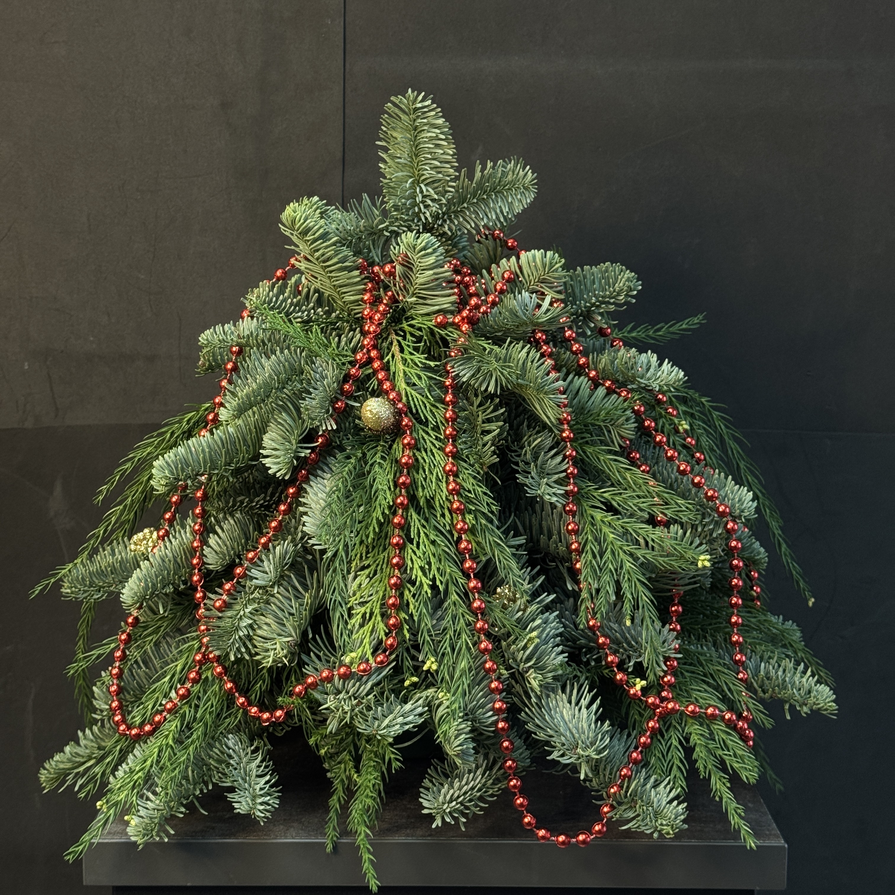 Елочка из веток нобилиса, композиция из живых еловых веток и новогодних украшений
