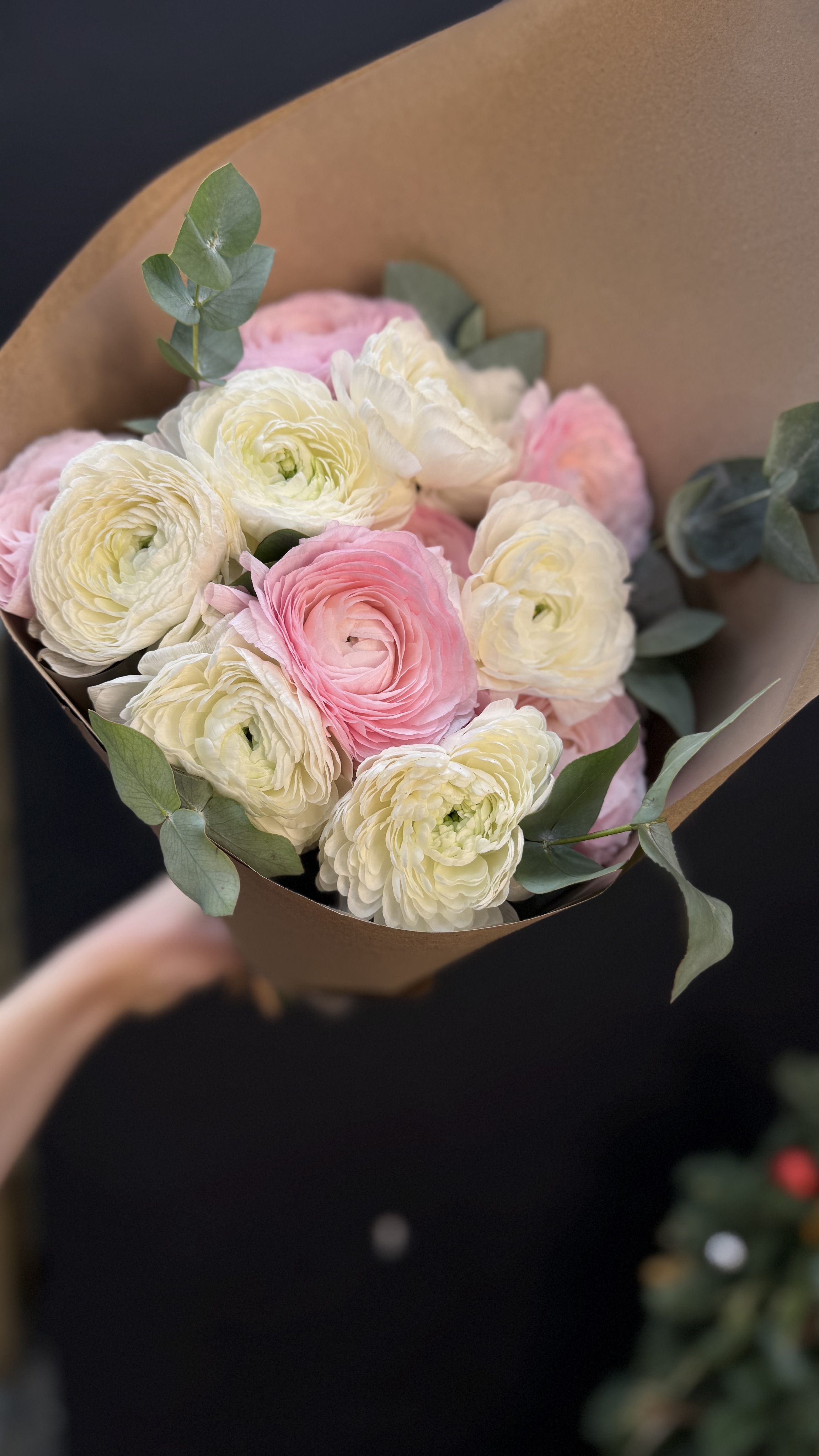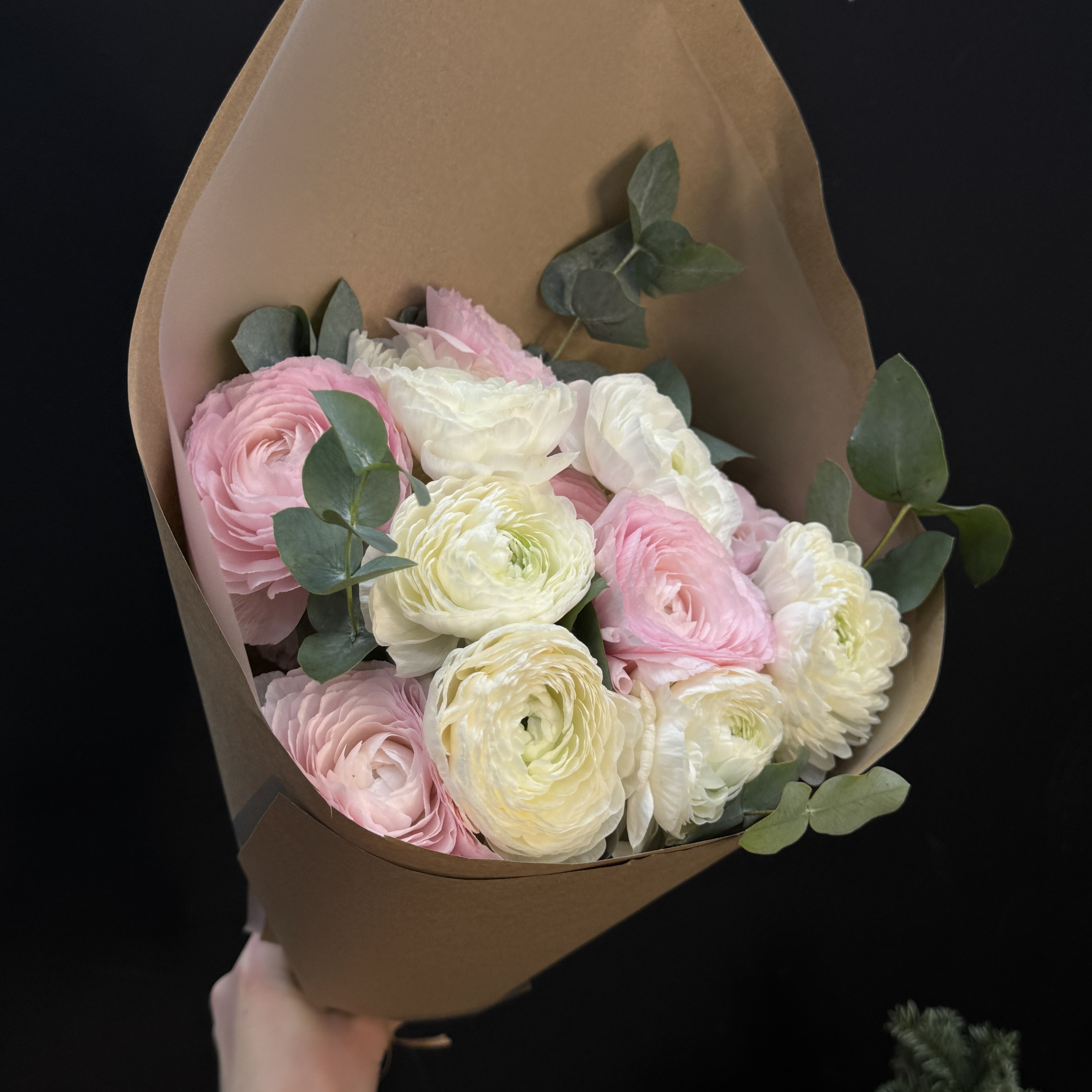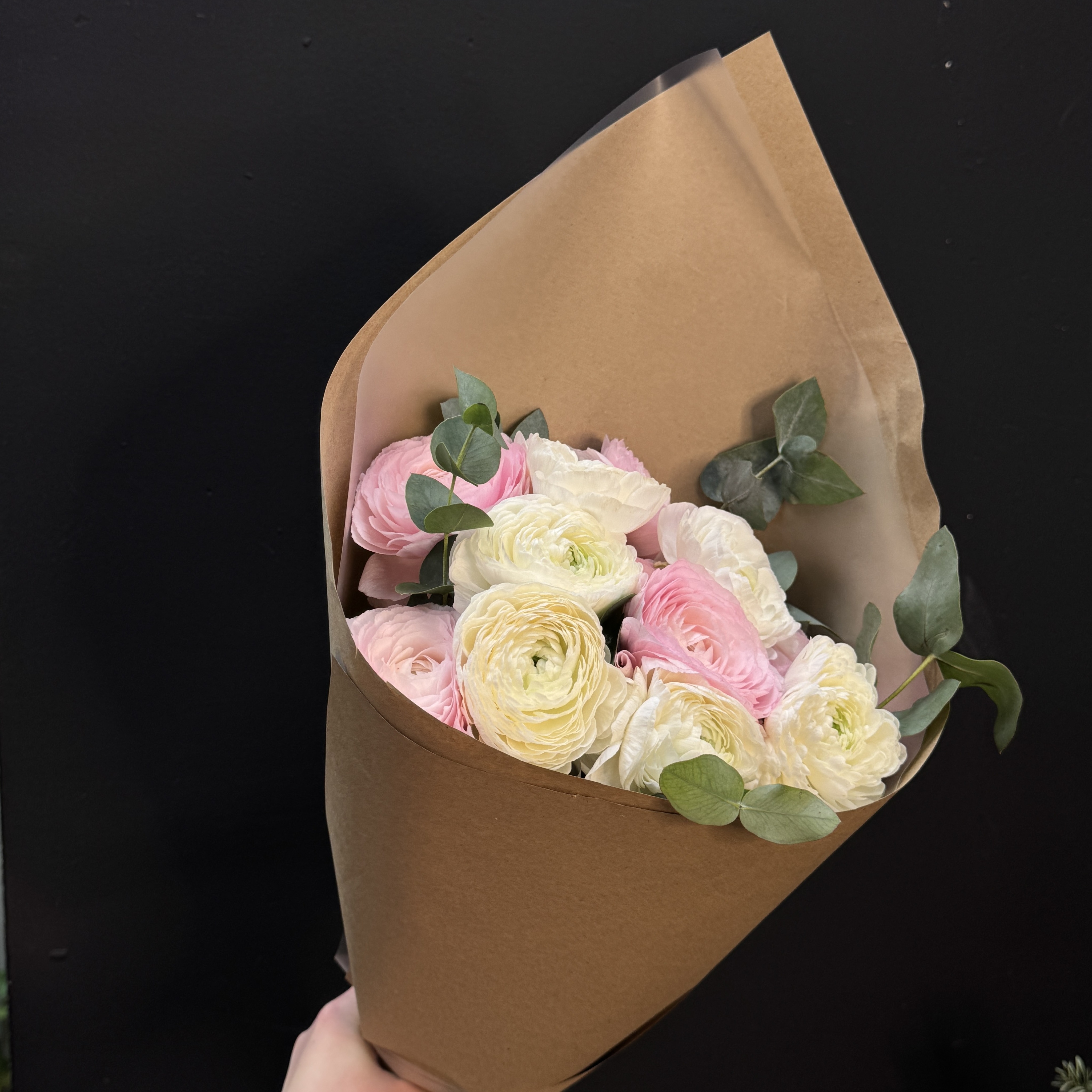 Монобукет из ранункулюсов с весточками эвкалипта в крафтовой упаковке