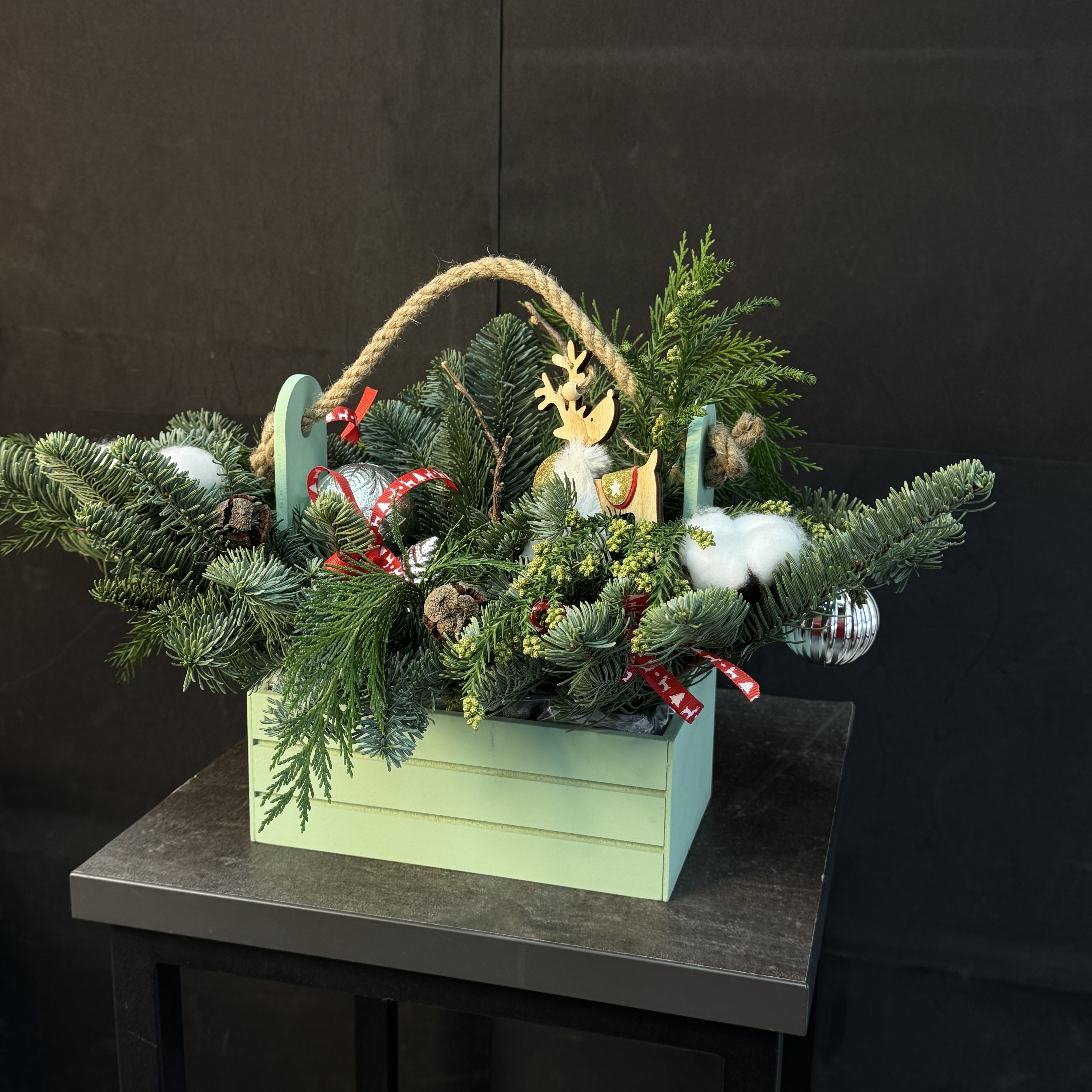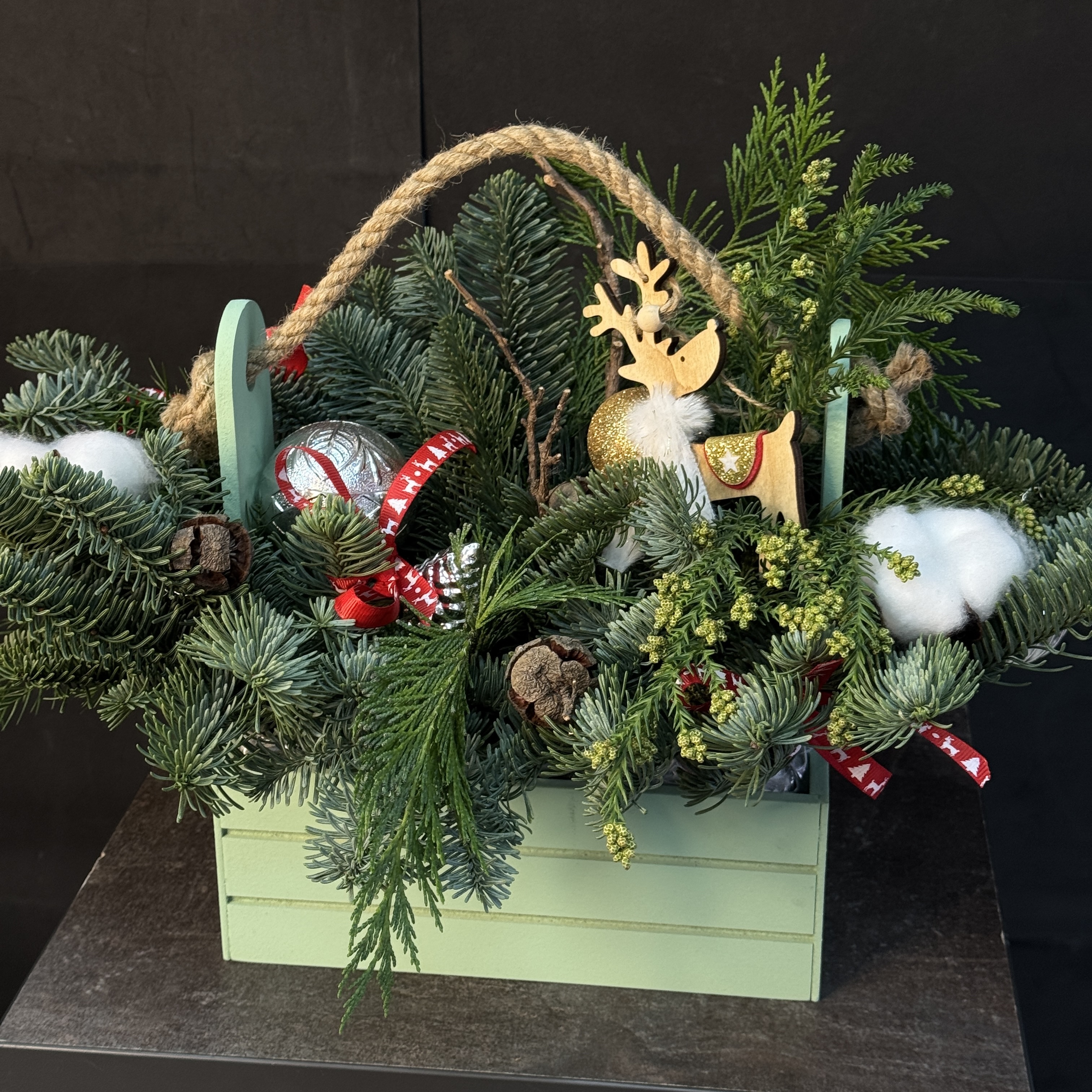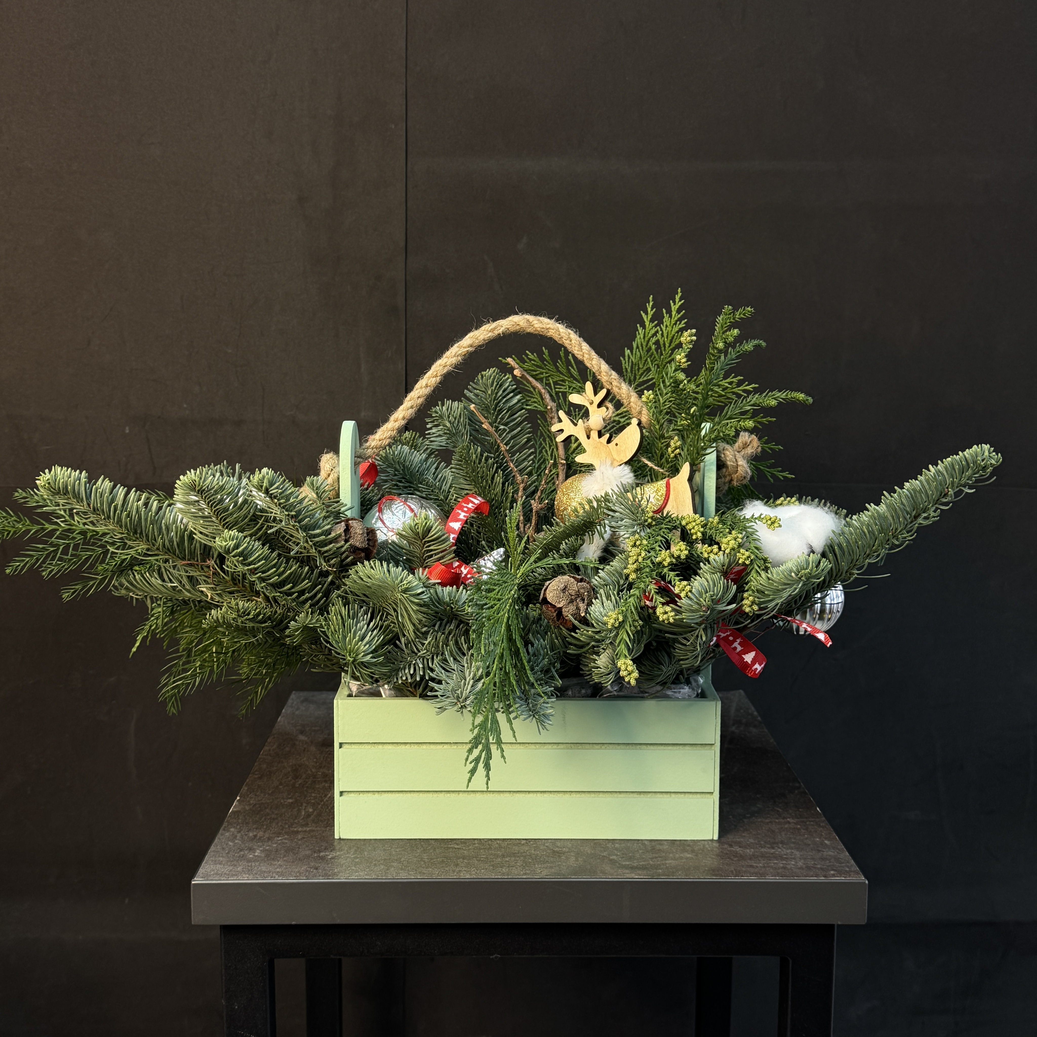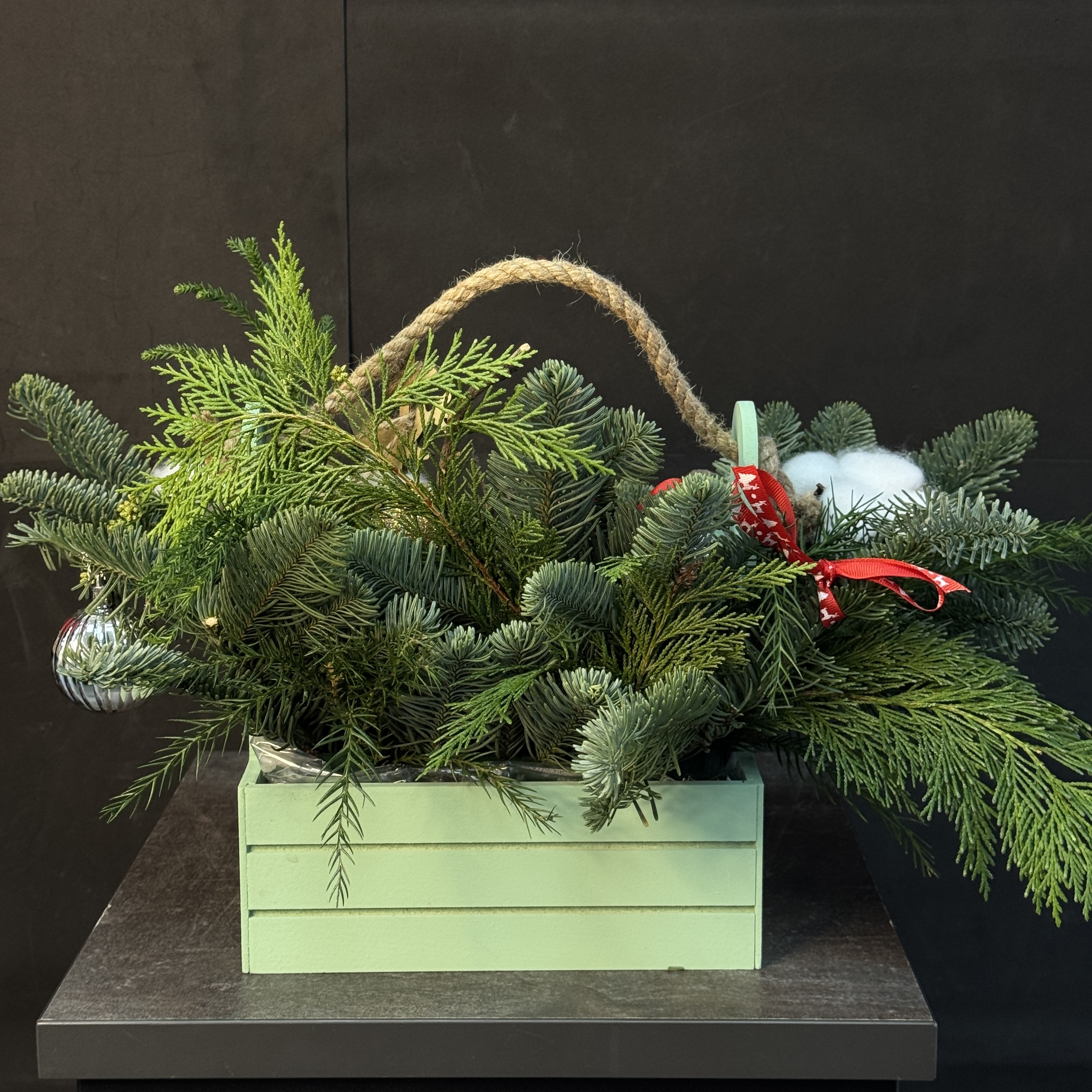 Новогодняя композиция из живых веток нобилиса, туи и мережки с елочными игрушками