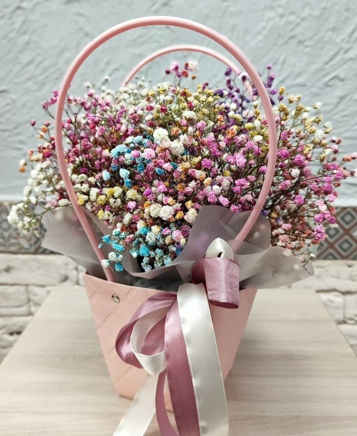 Прекрасный выбор для тех, кто ценит элегантность и стиль! Наша сумочка с разноцветной гипсофилой от бренда MyCvety станет изысканным дополнением к вашему образу. Благодаря ярким цветам и стильной упаковке, она привлечет внимание окружающих и подчеркнет ваш вкус. Не упустите возможность приобрести этот модный аксессуар уже сегодня!
