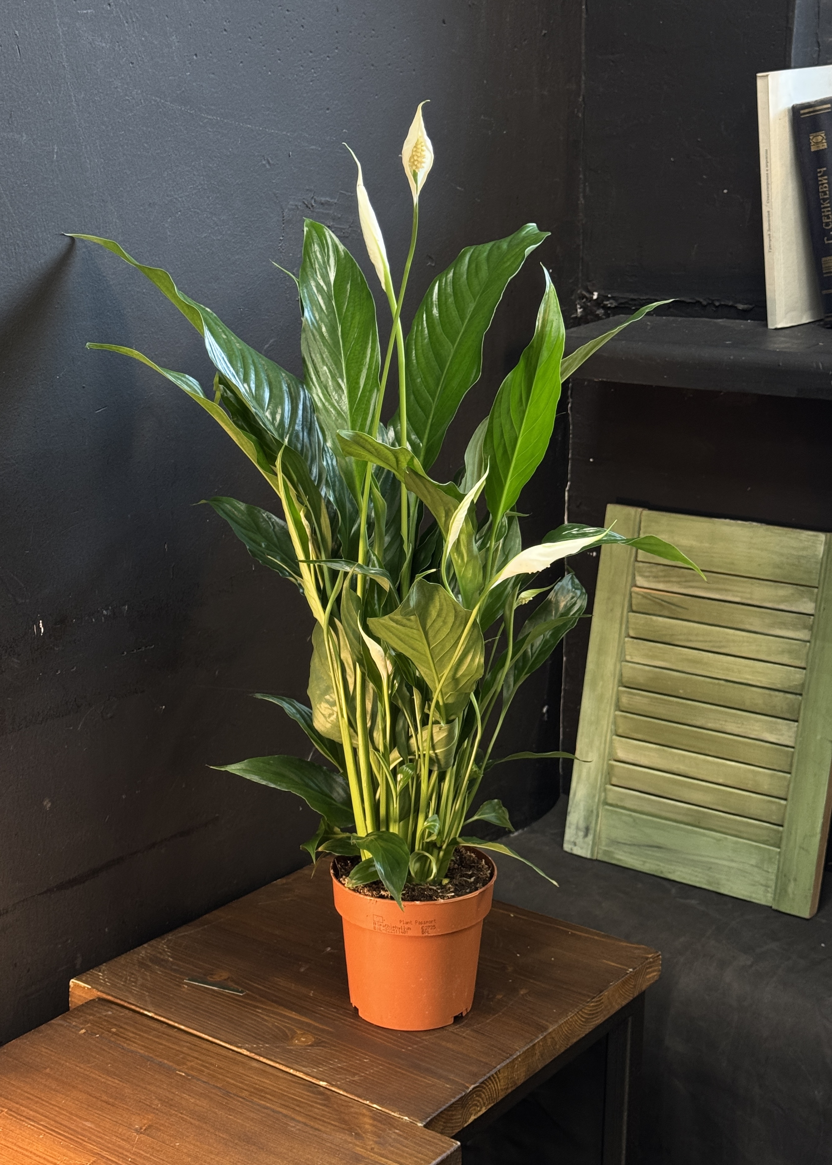 Спатифиллум — это элегантное комнатное растение с глянцевыми зелёными листьями и белыми цветами в форме лодочки. Оно ценится за способность очищать воздух от токсинов и просту в уходе. Растение любит яркий рассеянный свет и регулярный, но умеренный полив, избегая застоя воды. Важно поддерживать высокую влажность воздуха и периодически протирать листья. Спатифиллум хорошо реагирует на подкормки весной и летом, что способствует его активному росту и цветению.